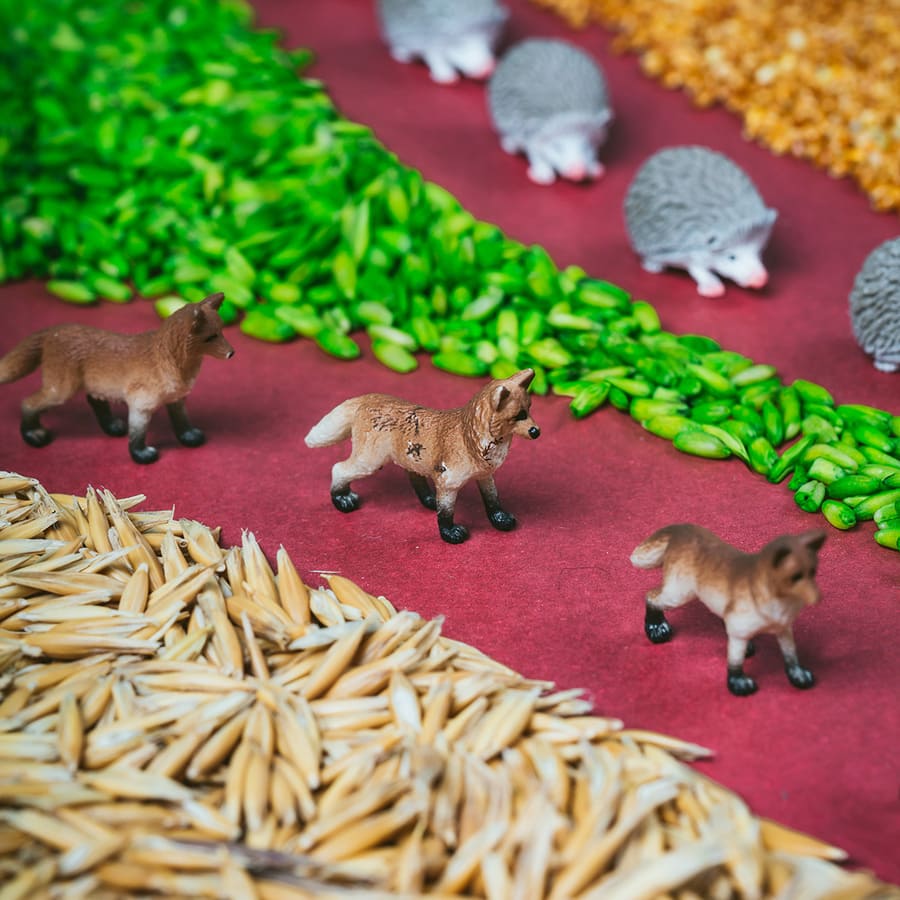 – Bouteille sensorielle faite à partir de plastique recyclable, d’un bouchon en bois d’érable et contenant des éléments naturels divers