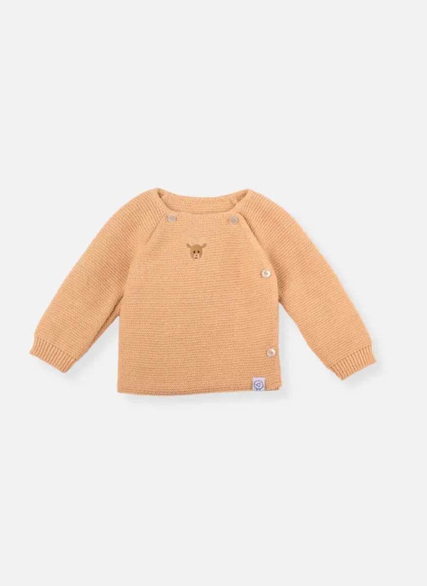 Brassière bébé tricotée en France, avec quatre boutons latéraux et une délicate broderie renne. Douce, pratique et pleine de charme hivernal.