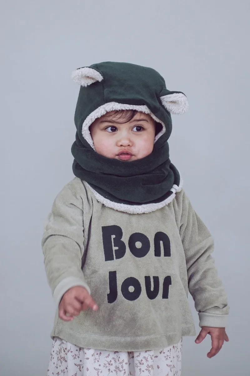 Nouvelle version de la cagoule de la marque Minabulle qui cache à la fois les petites oreilles et le cou des enfants pour tenir bien chaud.