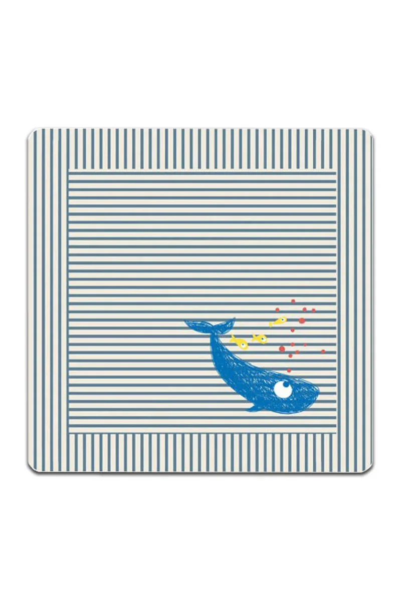 Jolie cape de bain crème en coton BIO sérigraphiée avec ses fines rayures bleu bretagne.