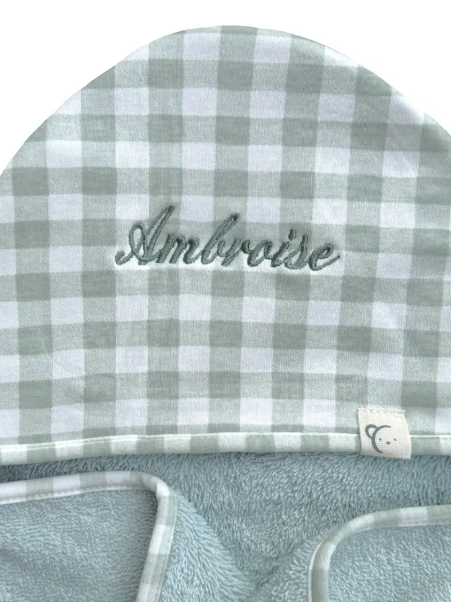 Grâce à sa possibilité de personnalisation avec le prénom de bébé, cette cape de bain bleue vichy devient un cadeau de naissance garçon unique et plein de sens. Utile, durable et raffiné, cet ensemble séduit les jeunes parents en quête d’authenticité et de qualité.