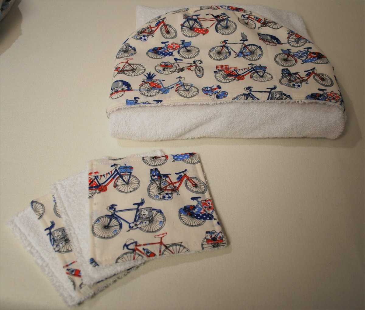 Cape de bain “BYKE” : Pour mettre bébé au chaud à sa sortie du bain environ 75×75 cm Tissus éponge et coton Lingettes vendues séparément Divers imprimés *Peut être assortie avec des lingettes du même imprimé, si vous voulez acheter les lingettes et la cape assortie envoyez nous un message*