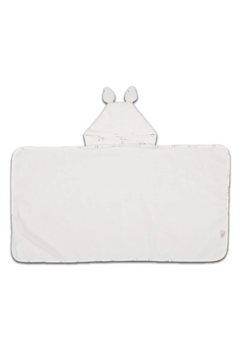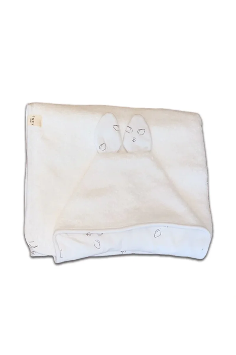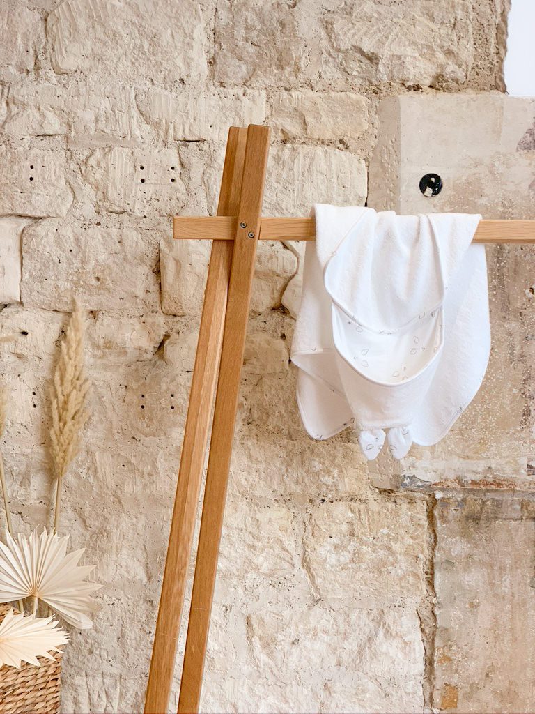 La capuche se trouve à l’extérieur de la serviette rectangulaire, elle est doublée en jersey de coton biologique, très absorbant, et surtout moins agressif pour la petite tête fragile de bébé.