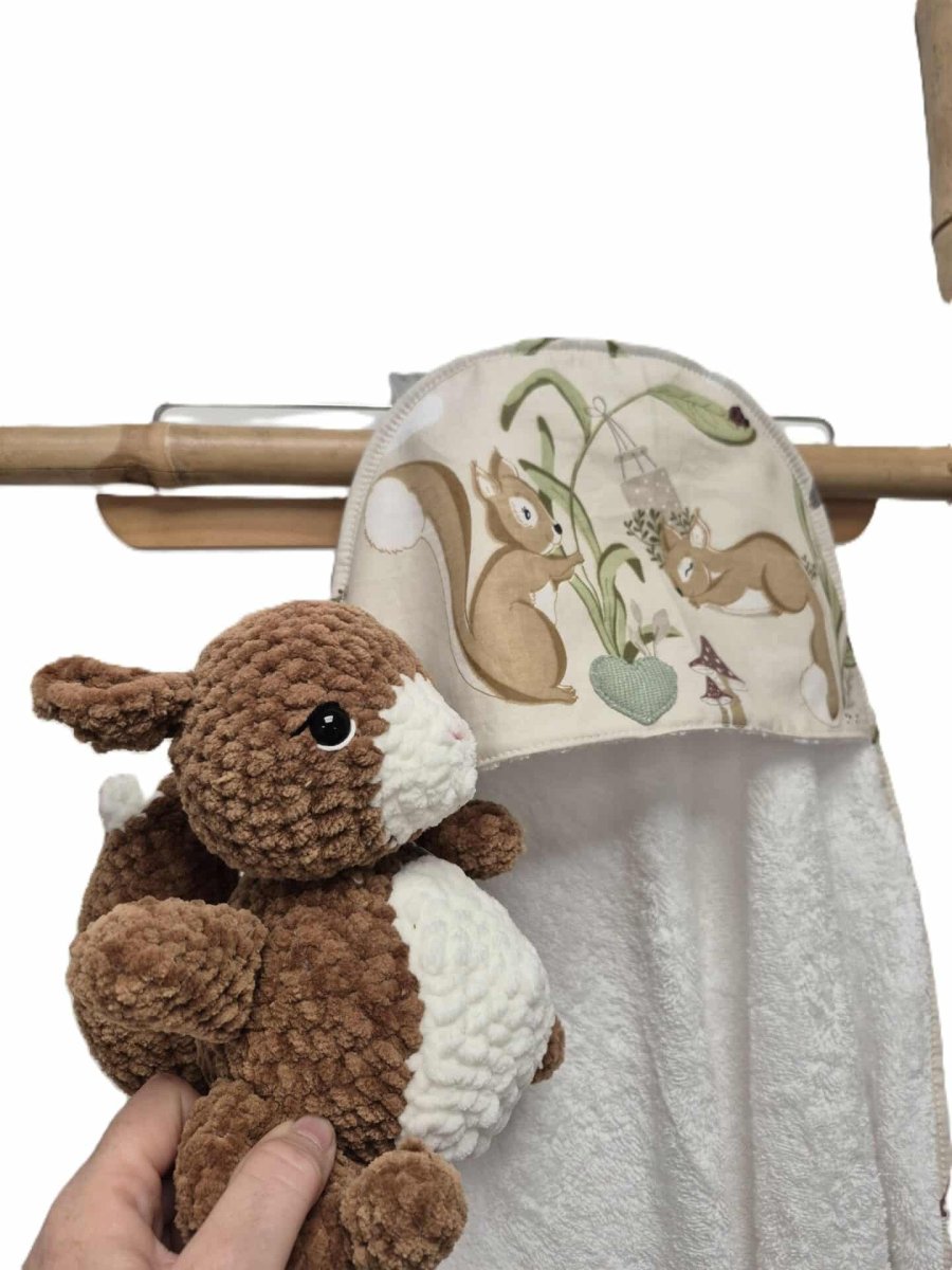 Soyez le premier à laisser votre avis sur “Cape de bain + Peluche écureuil – Cadeau de naissance fait main”