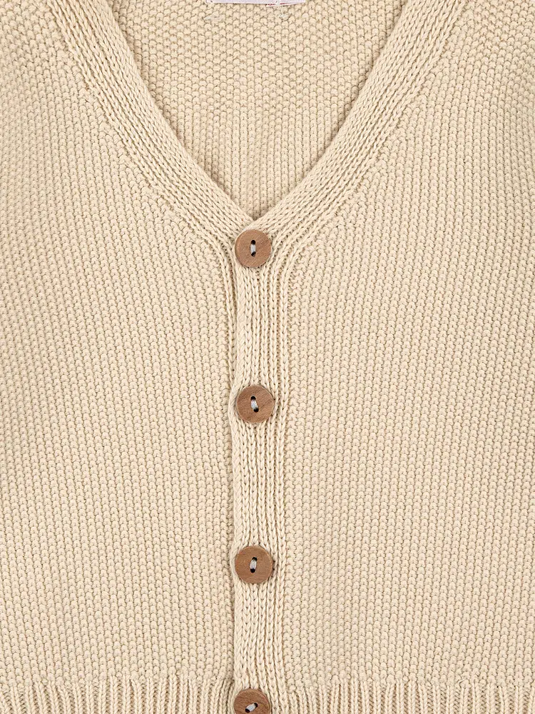 Ce modèle intemporel, avec son coloris beige, incarne le raffinement. Sa coupe pratique avec des boutons sur le devant permet un habillage facile, idéal pour les parents actifs. Ce cardigan est conçu pour accompagner les mouvements de bébé tout en maintenant une allure élégante. Portez-le par-dessus une robe, un bloomer ou un ensemble léger pour une touche finale sophistiquée et pleine de charme.