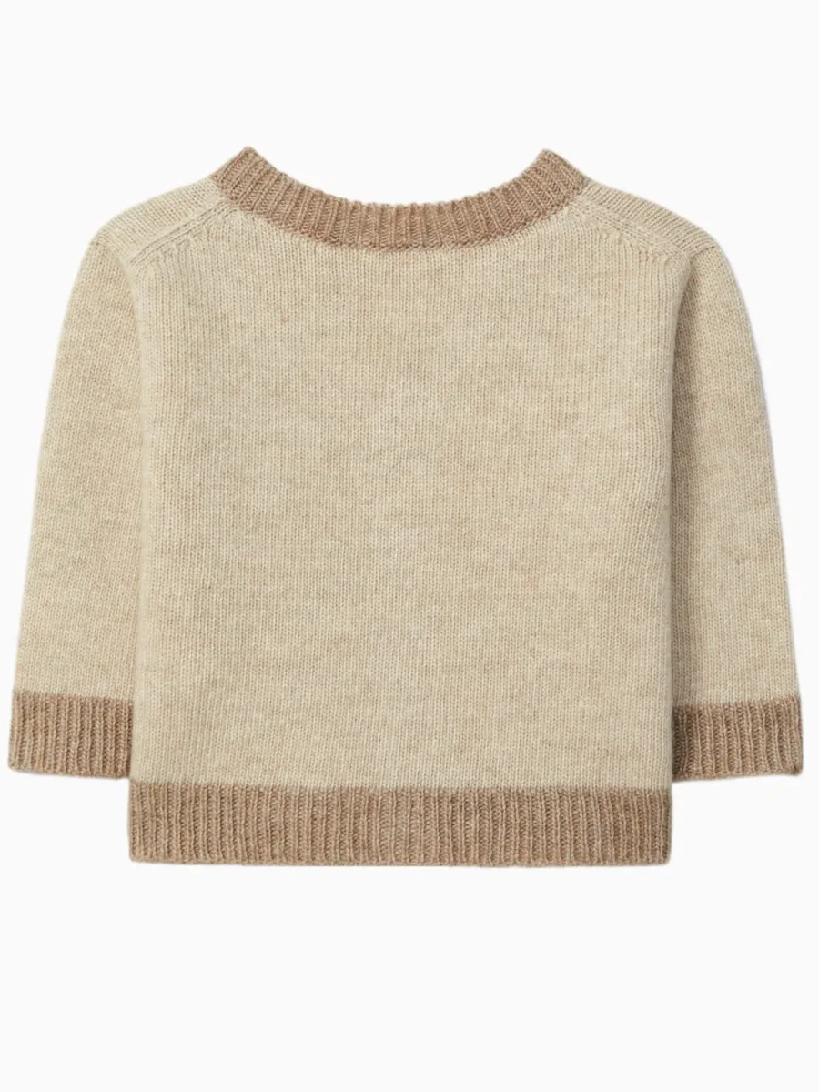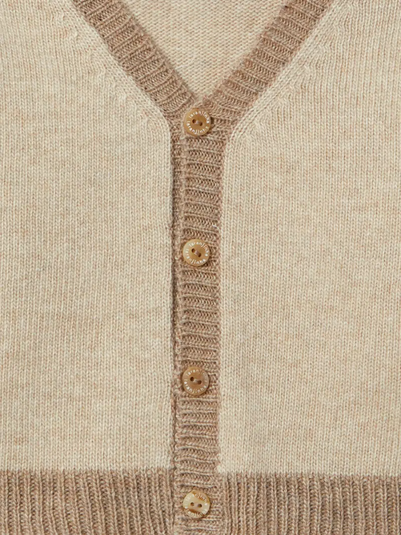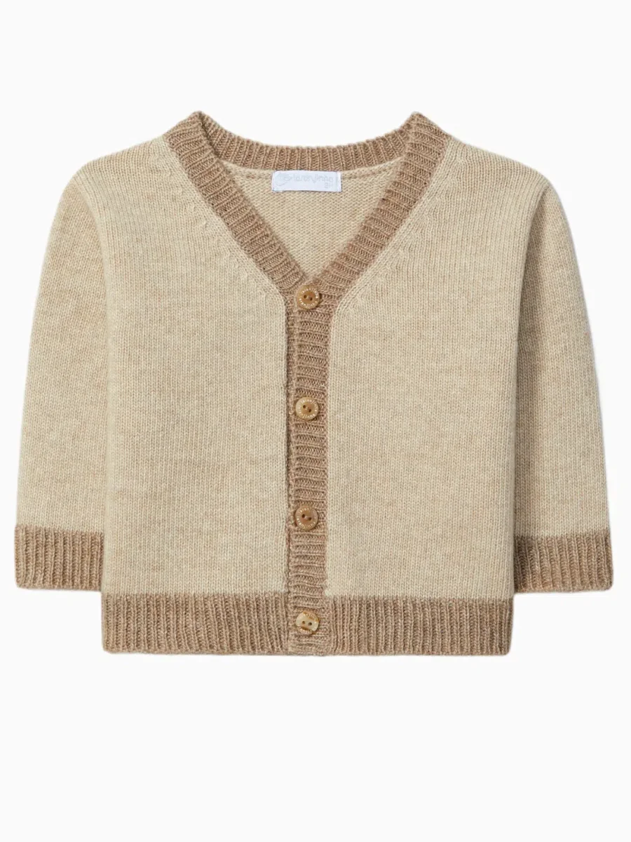 Notre cardigan bébé bicolore en maille beige incarne la douceur et l’élégance qui accompagnent les premiers mois de votre enfant. Conçu dans une maille fine avec une touche de cachemire, il offre chaleur, confort et style sans compromis, tout en s’inscrivant dans un vestiaire intemporel que vous aimerez transmettre.