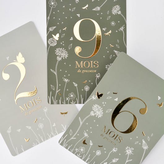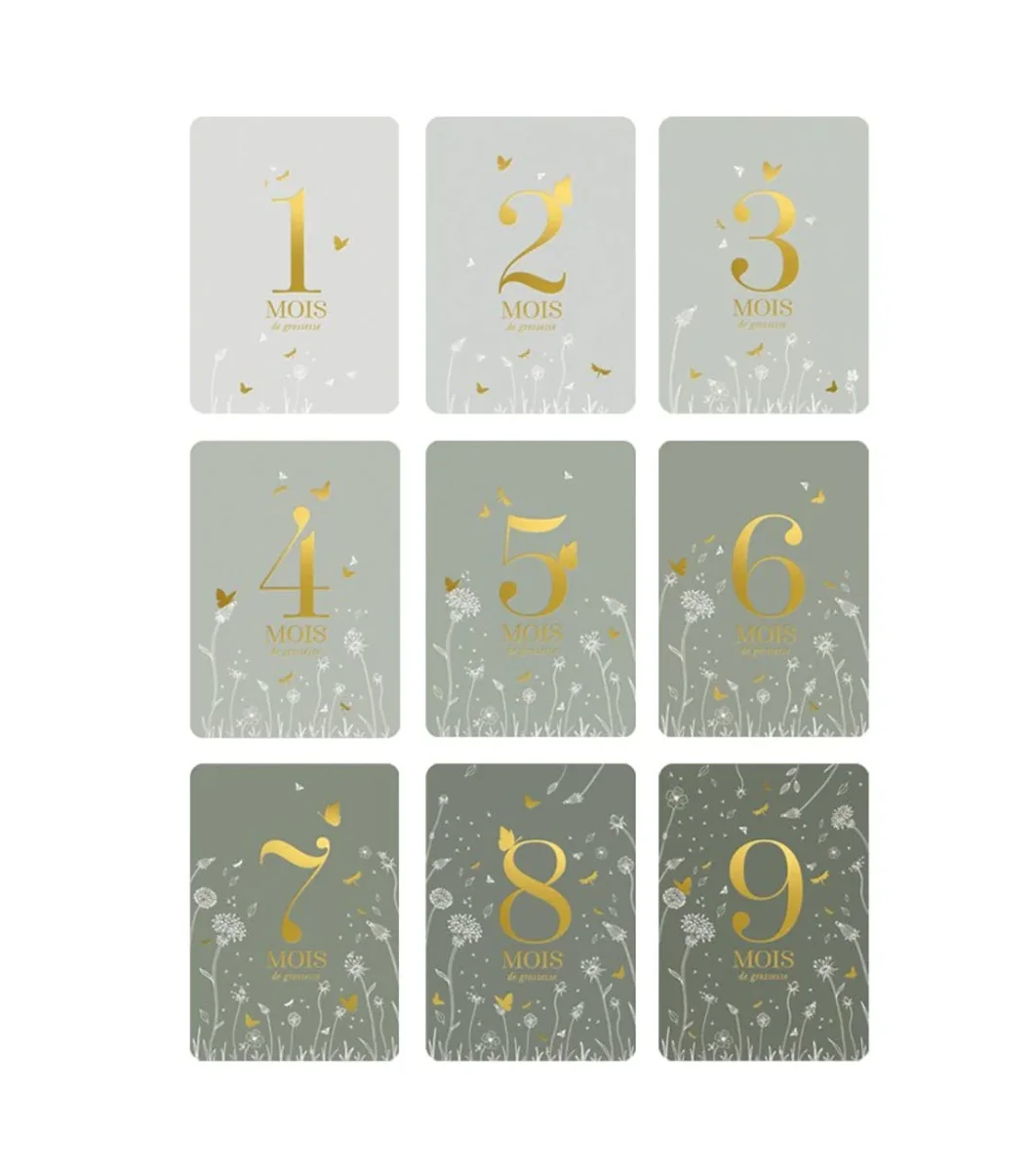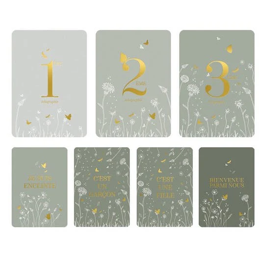 Composé de 15 cartes étapes grand format, avec une finition combinant dorure + pelliculage mat « Soft Touch », ce coffret vous permettra de prendre de superbes photos en souvenir et d’annoter au dos votre ressenti mois après mois.
