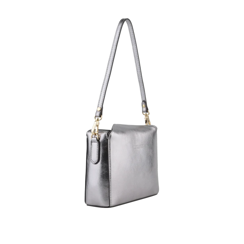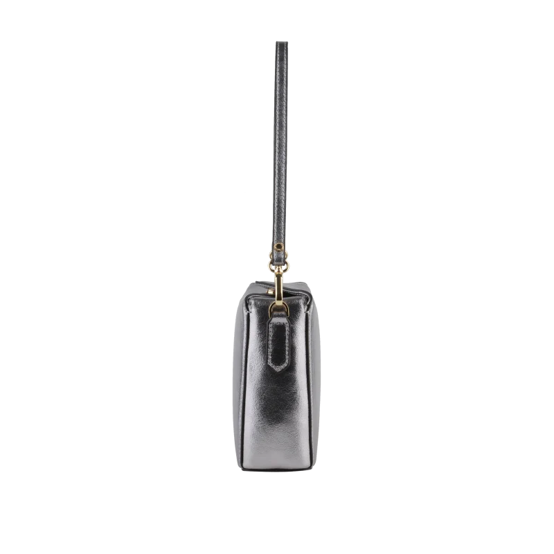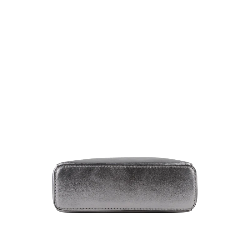 Ce sac présente une couleur argentée avec une texture lisse et durable, fabriqué en cuir de vachette. Sa forme rectangulaire et ses dimensions de 19 x 15 x 6 cm en font un accessoire pratique, idéal pour transporter l’essentiel sans encombrement.