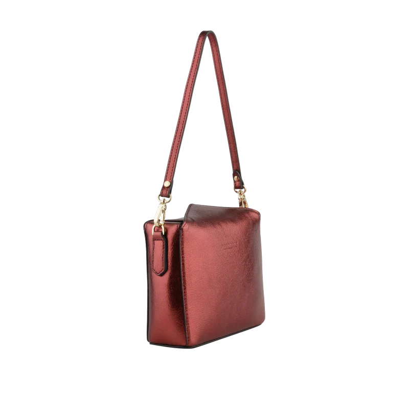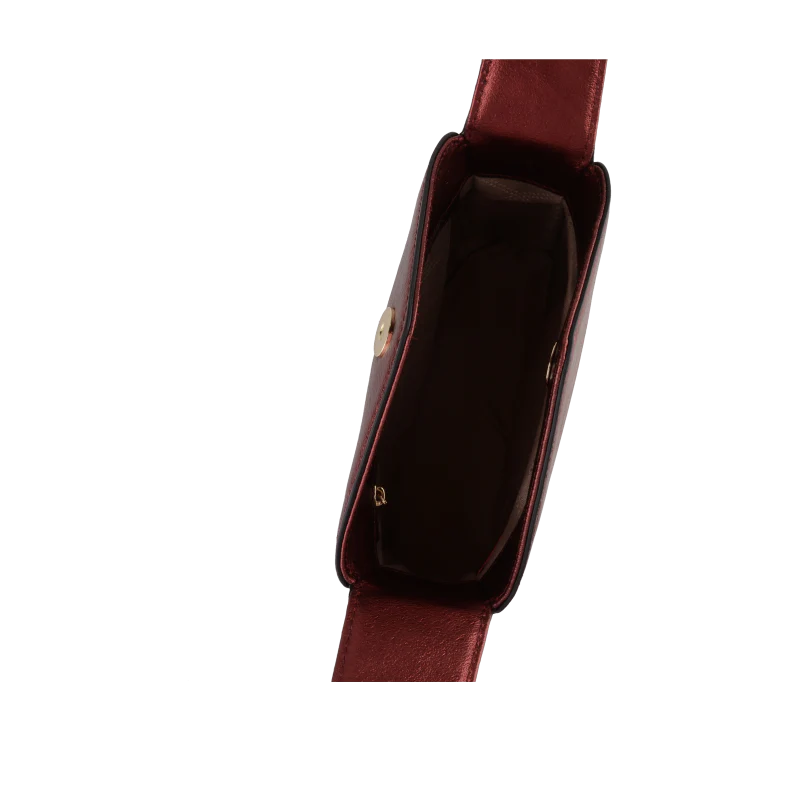 Les dimensions du sac, mesurant 19 x 15 x 6 cm, offrent un espace général idéal pour organiser vos essentiels. À l’intérieur, vous trouverez une doublure synthétique qui contraste élégamment avec l’extérieur métallique. Le sac est équipé d’une poche zippée et d’une poche plaquée, permettant un accès facile à vos objets personnels.
