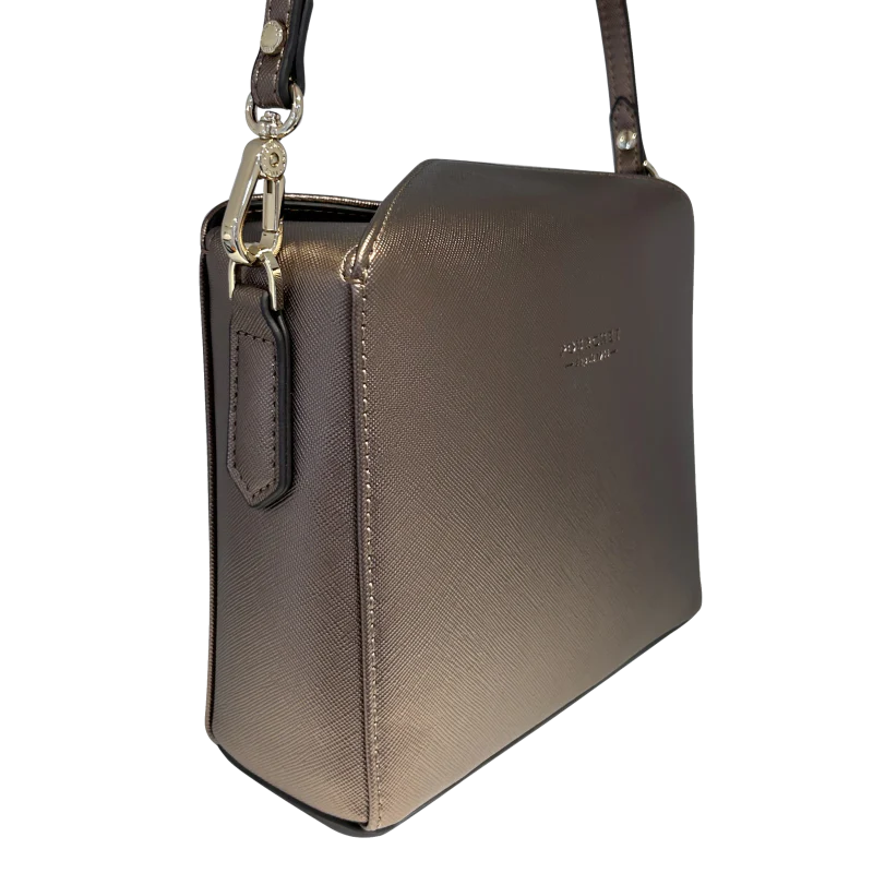 Bien que sa couleur principale soit le bronze, le sac présente des reflets changeants selon la lumière, ce qui lui confère un aspect dynamique. Ce sac est un choix idéal pour celles qui recherchent un accessoire à la fois pratique et stylé, capable de s’adapter à différentes tenues et occasions.