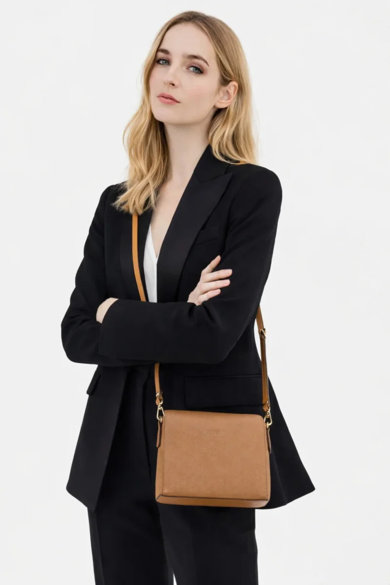 À l’intérieur, le sac dispose d’un compartiment principal spacieux, accompagné d’une poche zipée et d’une poche plaquée pour un rangement optimal de vos essentiels. Les finitions en métal doré ajoutent une touche de sophistication, tandis que le logo de la marque est discrètement embossé sur le devant, soulignant le soin apporté aux détails.