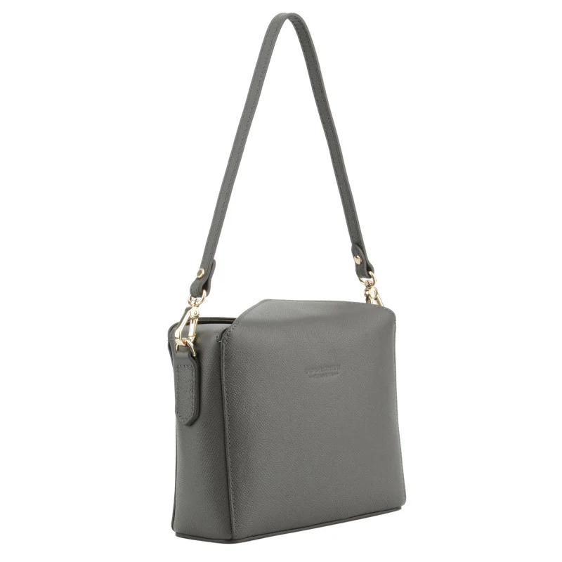 Fabriqué en toile texturée, ce sac présente une finition de haute qualité, offrant une allure sophistiquée et durable. Sa silhouette structurée, avec des angles légèrement arrondis, lui confère un aspect moderne et chic, idéal pour un usage quotidien.