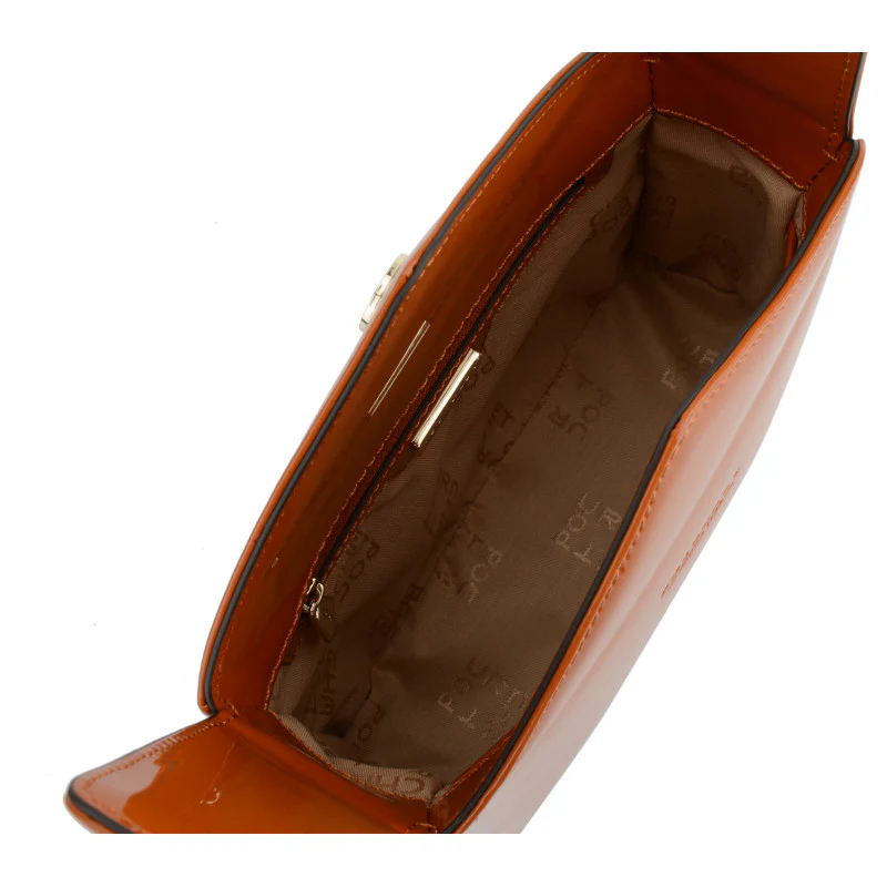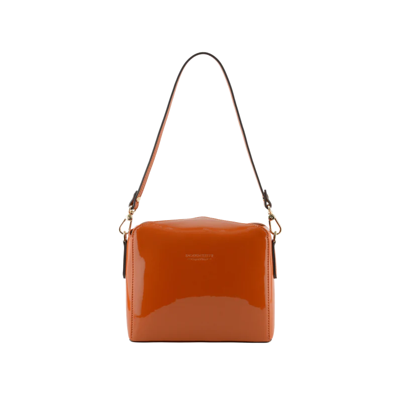 Ce sac à main Cassetta en vernis orange est orné du logo de la marque en relief sur le devant, témoignant d’une fabrication de qualité et d’une attention aux détails. Les coutures soignées renforcent son identité de marque et sa durabilité.