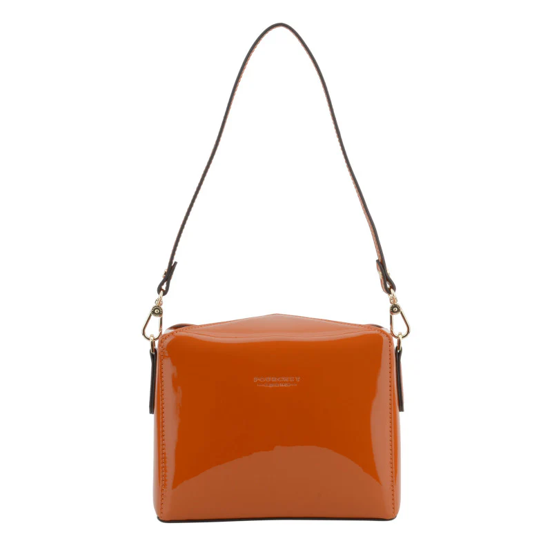 Fabriqué en vernis, ce sac présente une texture lisse et réfléchissante, tandis que les détails en cuir ajoutent une touche de sophistication. Sa forme rectangulaire avec des angles légèrement arrondis lui confère une allure contemporaine, tout en étant compact pour un usage quotidien.