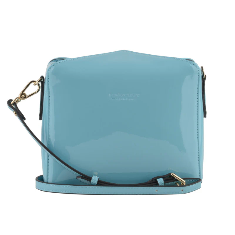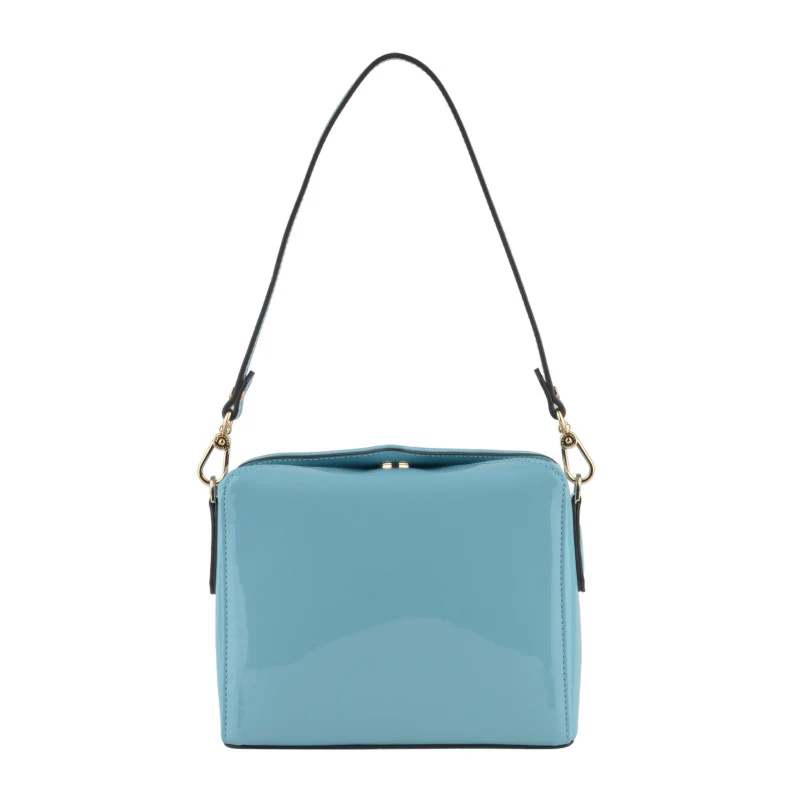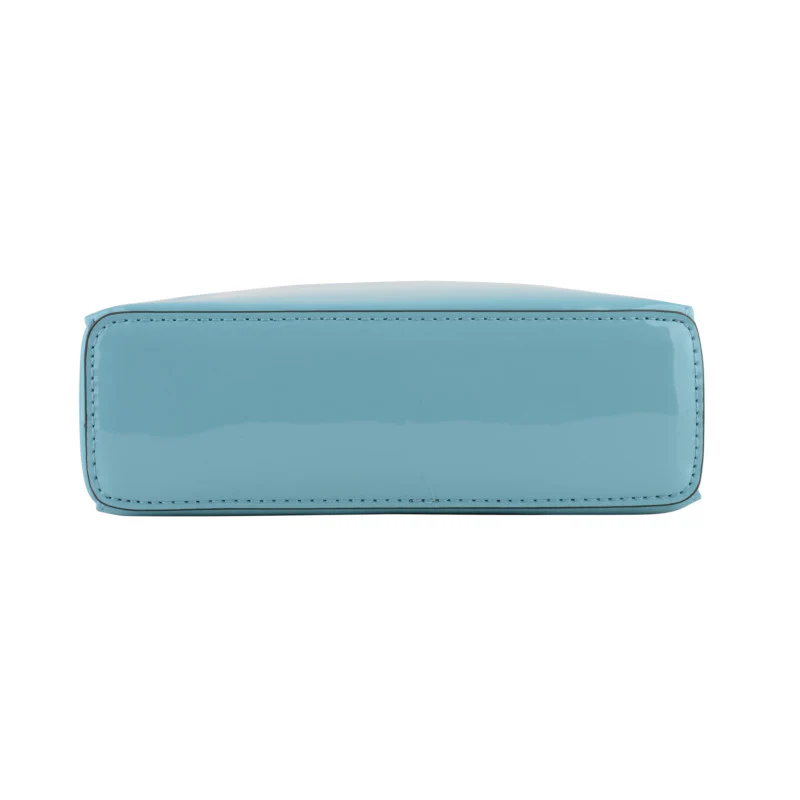 Le Cassetta | Vernis Lagon est un sac à main qui se distingue par sa couleur bleu lagon éclatant et sa finition laquée, offrant un aspect brillant et élégant. Fabriqué en cuir verni, il présente une texture lisse et réfléchissante, tandis que les détails en métal doré ajoutent une touche de sophistication.
