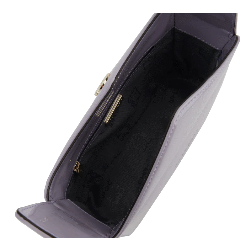 Pour un accès facile, le sac s’ouvre sur le dessus, révélant un intérieur doublé d’un tissu noir orné du logo de la marque. Ce contraste élégant avec l’extérieur lilas renforce son charme.