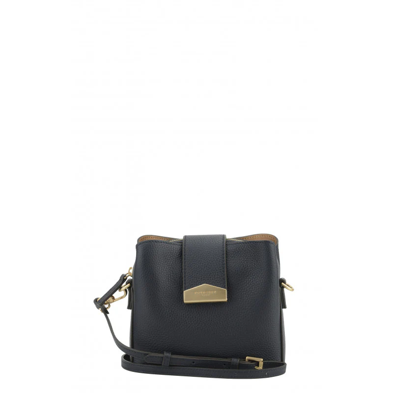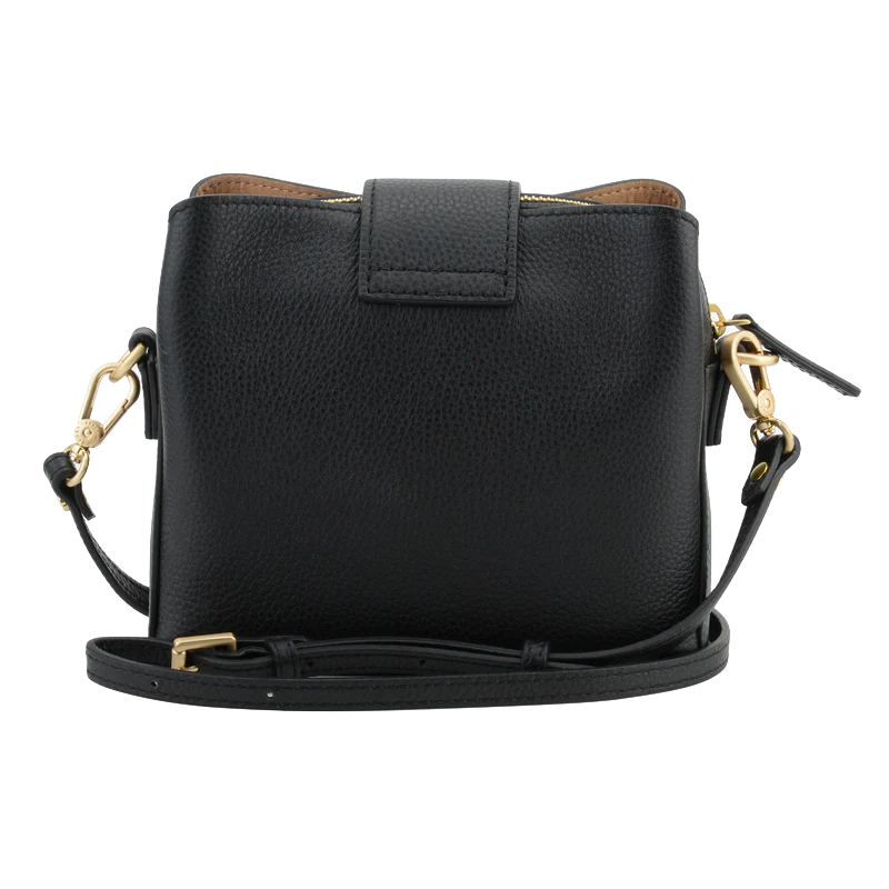Un détail qui fait la différence est la plaque dorée à l’avant, ajoutant une touche de sophistication. Les finitions dorées des attaches et de la bandoulière contrastent élégamment avec le cuir noir, rehaussant le style général du sac.