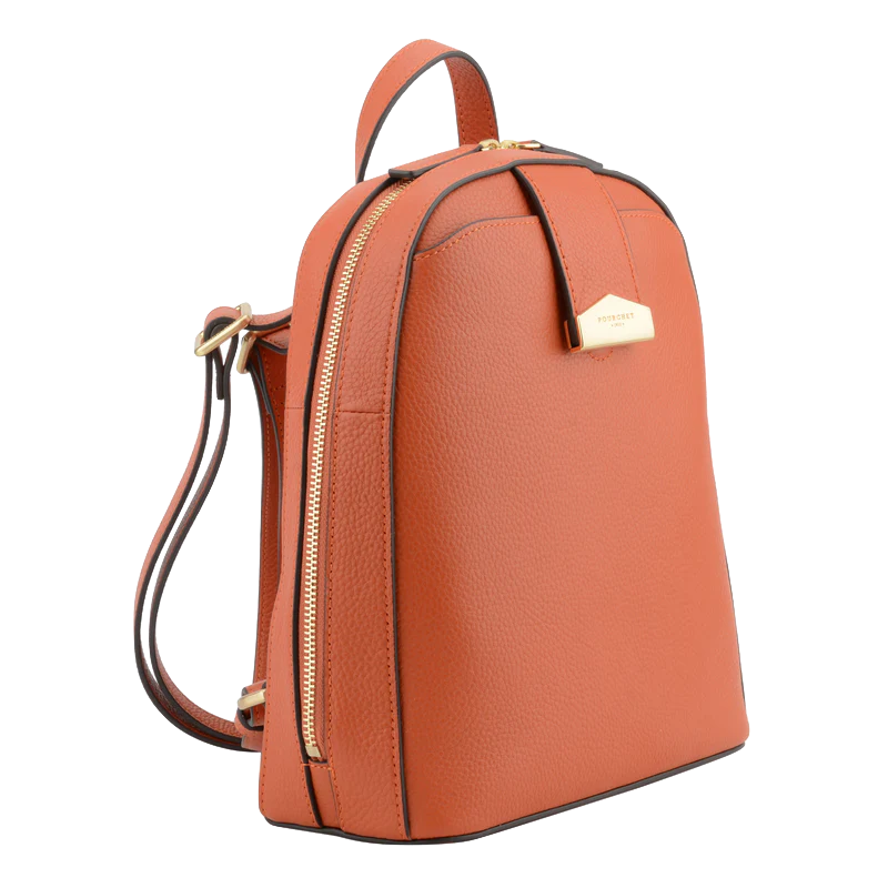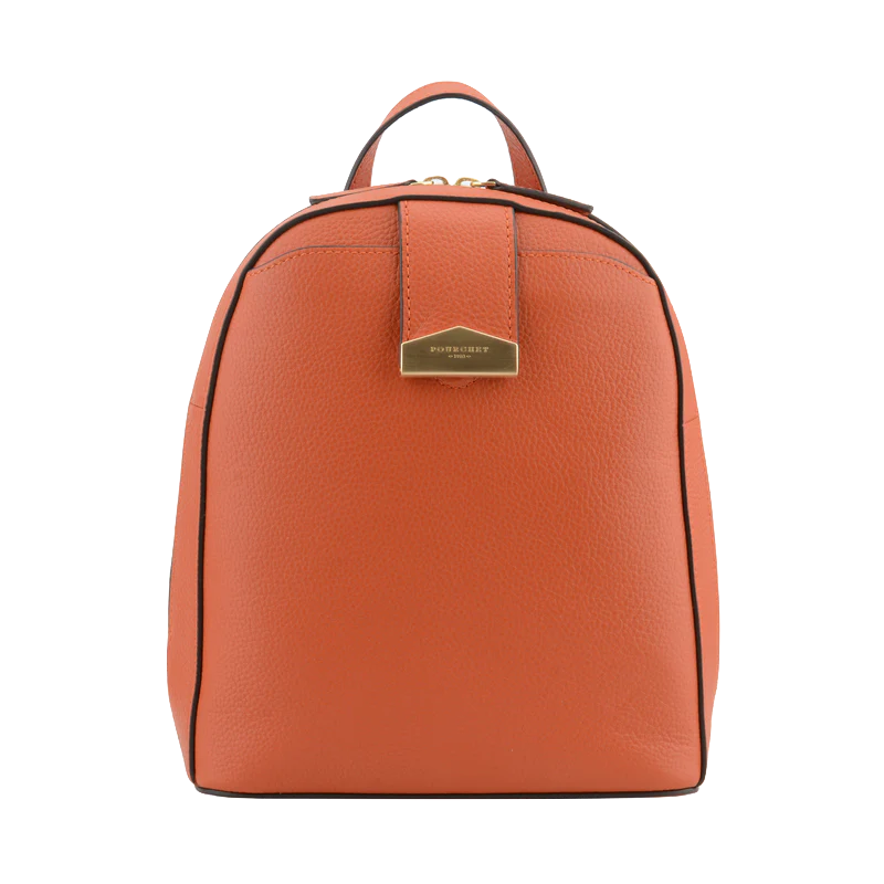 Pour un transport aisé, le sac est équipé d’une poignée supérieure pour un port à la main, ainsi que de bretelles ajustables permettant un port confortable sur le dos. Des accents en cuir noir contrastent harmonieusement avec la couleur orange, ajoutant une touche de sophistication. Un logo en métal est également présent à l’avant, renforçant l’identité de la marque Pourchet.