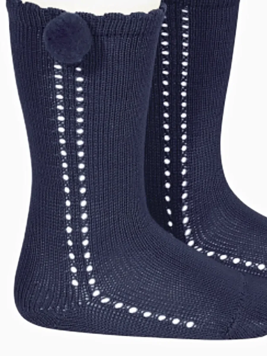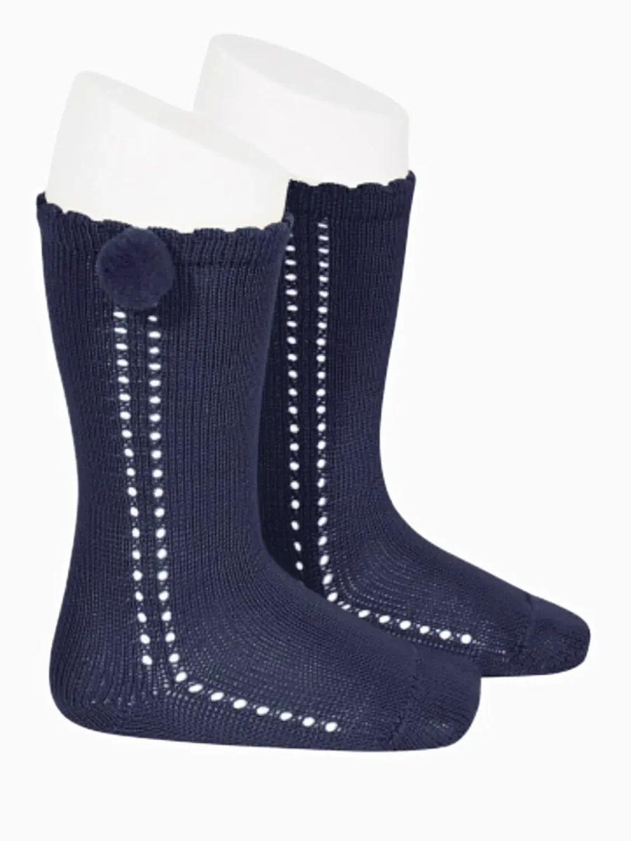 Chaussettes hautes bébé ajourées à pompon – Bleu marine