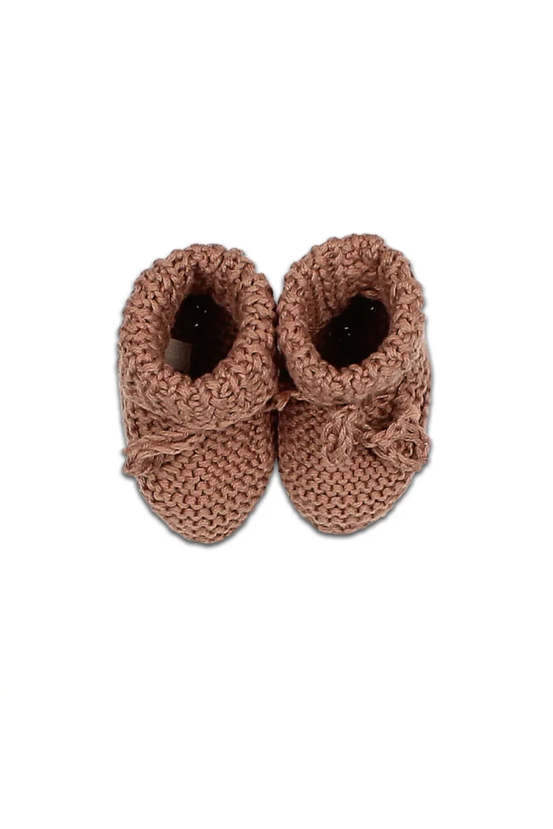 Chaussons en tricot avec un petit rabat et un cordon décoratif.