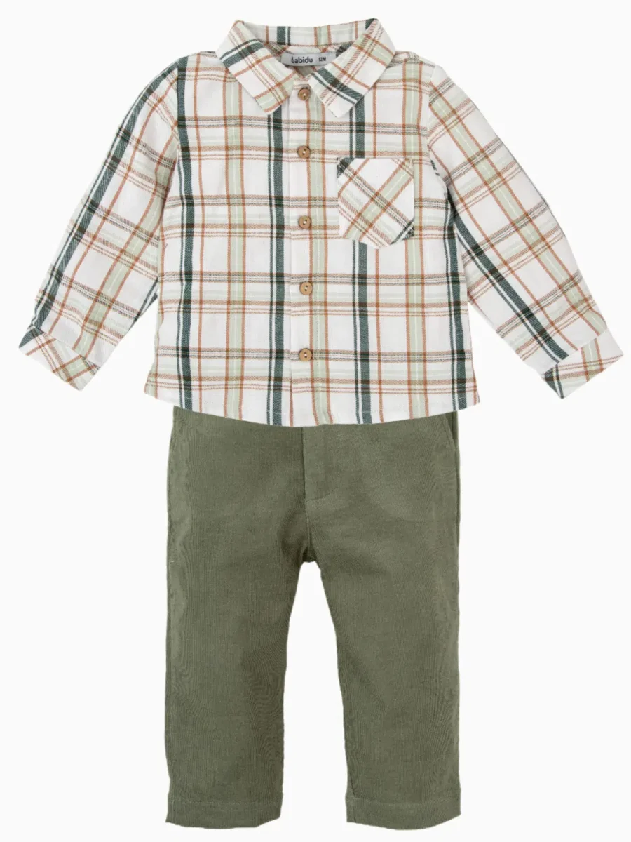 Associée au pantalon en velours vert, cette chemise crée une tenue harmonieuse et pleine de style. Cette combinaison est parfaite pour les occasions spéciales, les promenades en famille ou simplement pour un look décontracté mais élégant. Le velours vert du pantalon complète parfaitement le motif à carreaux de la chemise, créant ainsi un ensemble visuellement attrayant et confortable.