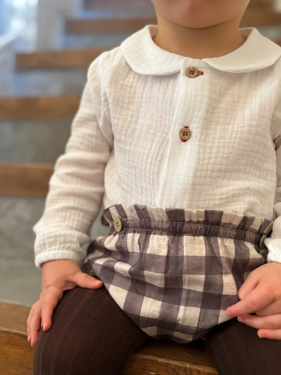 Associez cette chemise à col rond avec notre bloomer à grands carreaux marrons qui possède deux boutons décoratifs assortis à ceux de cette chemise pour composer un ensemble adorable et plein de caractère. Ce mariage de blanc éclatant et de carreaux marrons offre un contraste subtil mais distinctif, idéal pour capturer l’attention tout en conservant une élégance discrète.