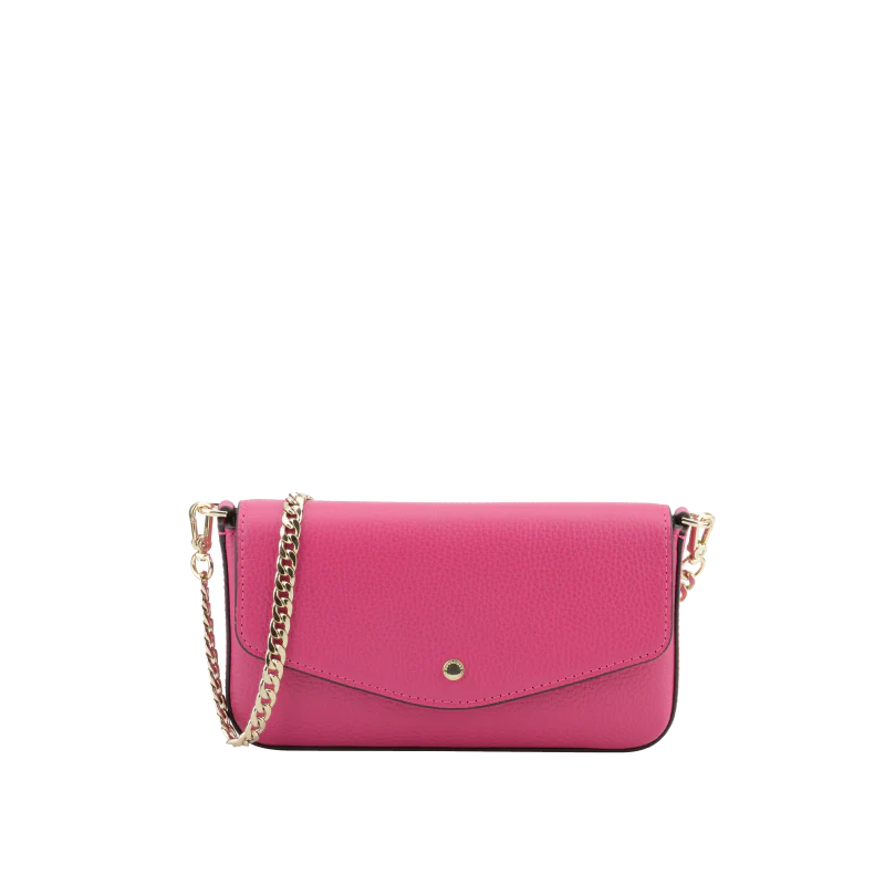 Les dimensions compactes de 21,5 x 13 x 3 cm en font un choix pratique pour transporter l’essentiel sans encombrement. Les finitions en cuir noir sur les bords apportent un contraste élégant à la couleur fuchsia, soulignant le design raffiné de ce sac.