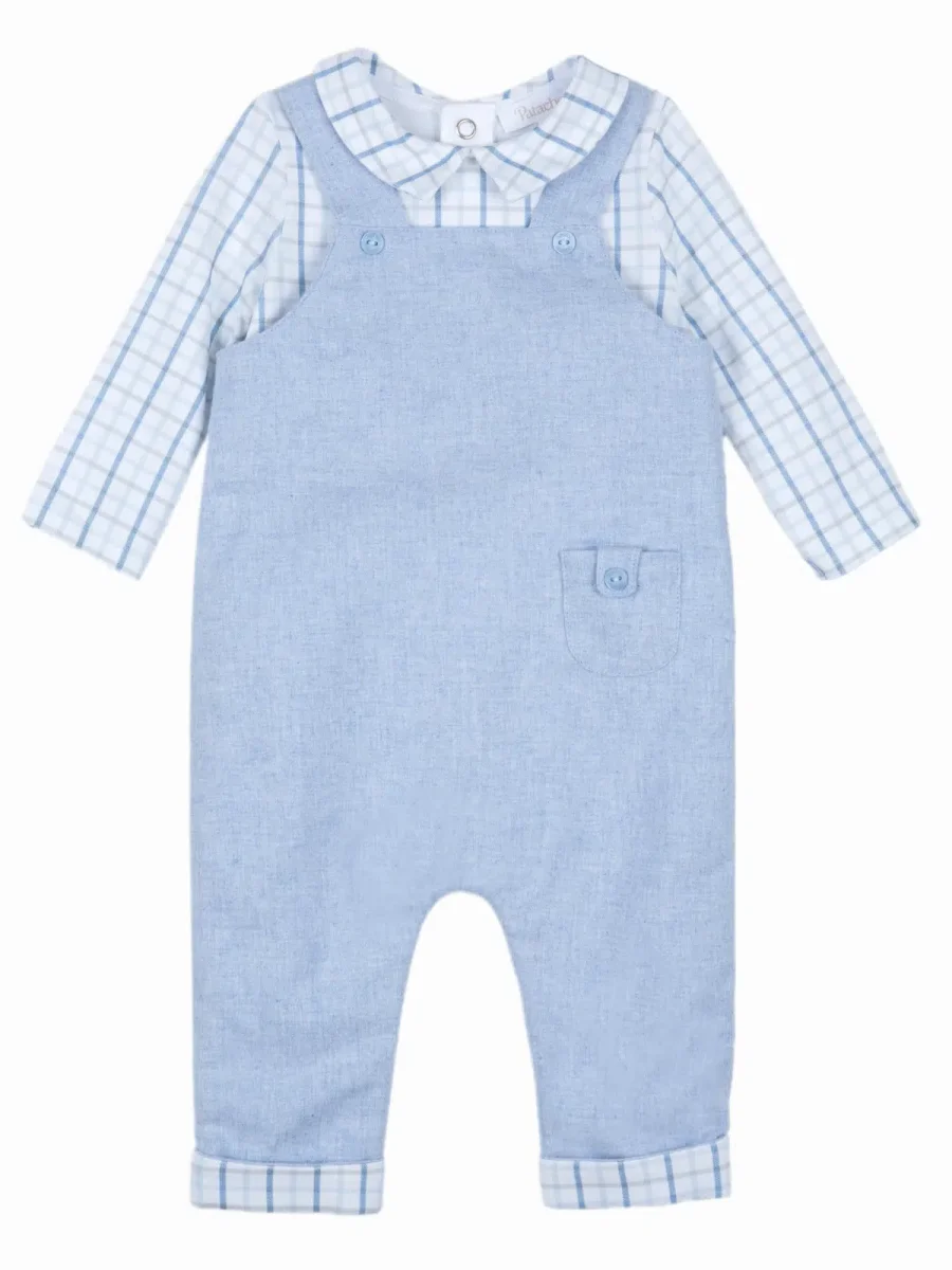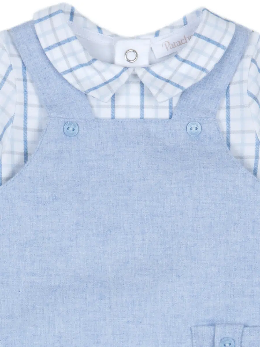 Cette combinaison bébé mixte se compose d’une salopette bleu tendre avec, cousue directement en dessous, une chemise à col à carreaux. Les deux parties sont indissociables : pas besoin de chercher un haut assorti le matin, tout est déjà pensé pour vous ! Un petit rappel du tissu à carreaux se retrouve également en bas des jambes, pour une finition élégante et harmonieuse.