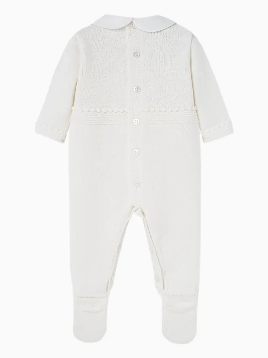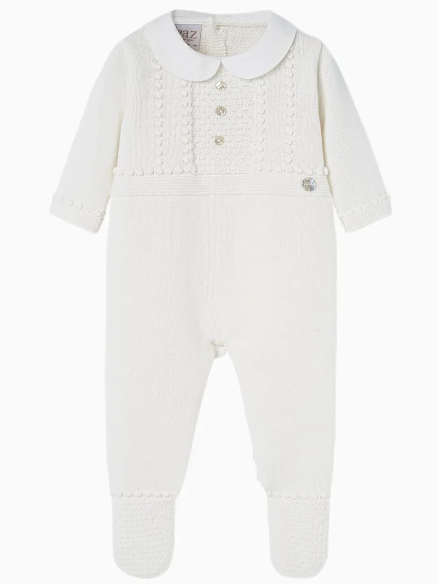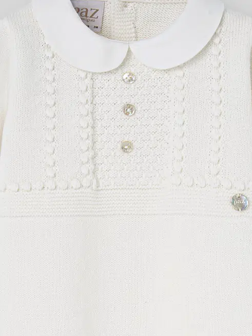 Combinaison une pièce à pieds Fermée par un patte de boutonnage au dos Assortie au Bonnet naissance en laine – Écru 100% laine douce Fabriquée en Espagne Cette combinaison taille normalement. Choisissez la taille habituelle