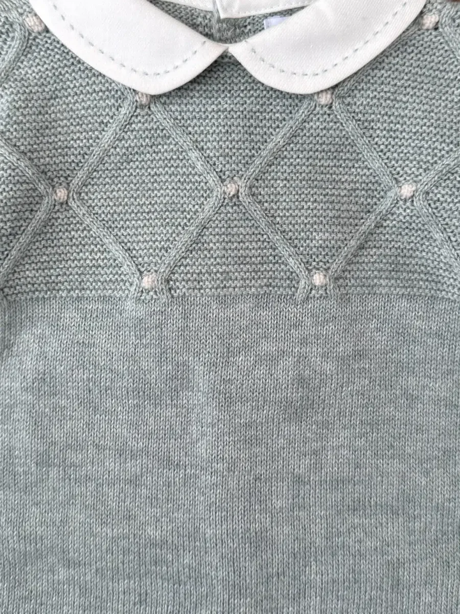 Le col rond blanc surpiqué apporte une note de raffinement et de lumière à cette combinaison verte, tandis que les losanges tricotés subtilement intégrés ajoutent un charme intemporel à cette pièce unique. Chaque détail a été pensé pour offrir à votre bébé une silhouette soignée et poétique, fidèle à l’univers Voyage de la Baleine, où l’élégance se mêle à la douceur de l’enfance.