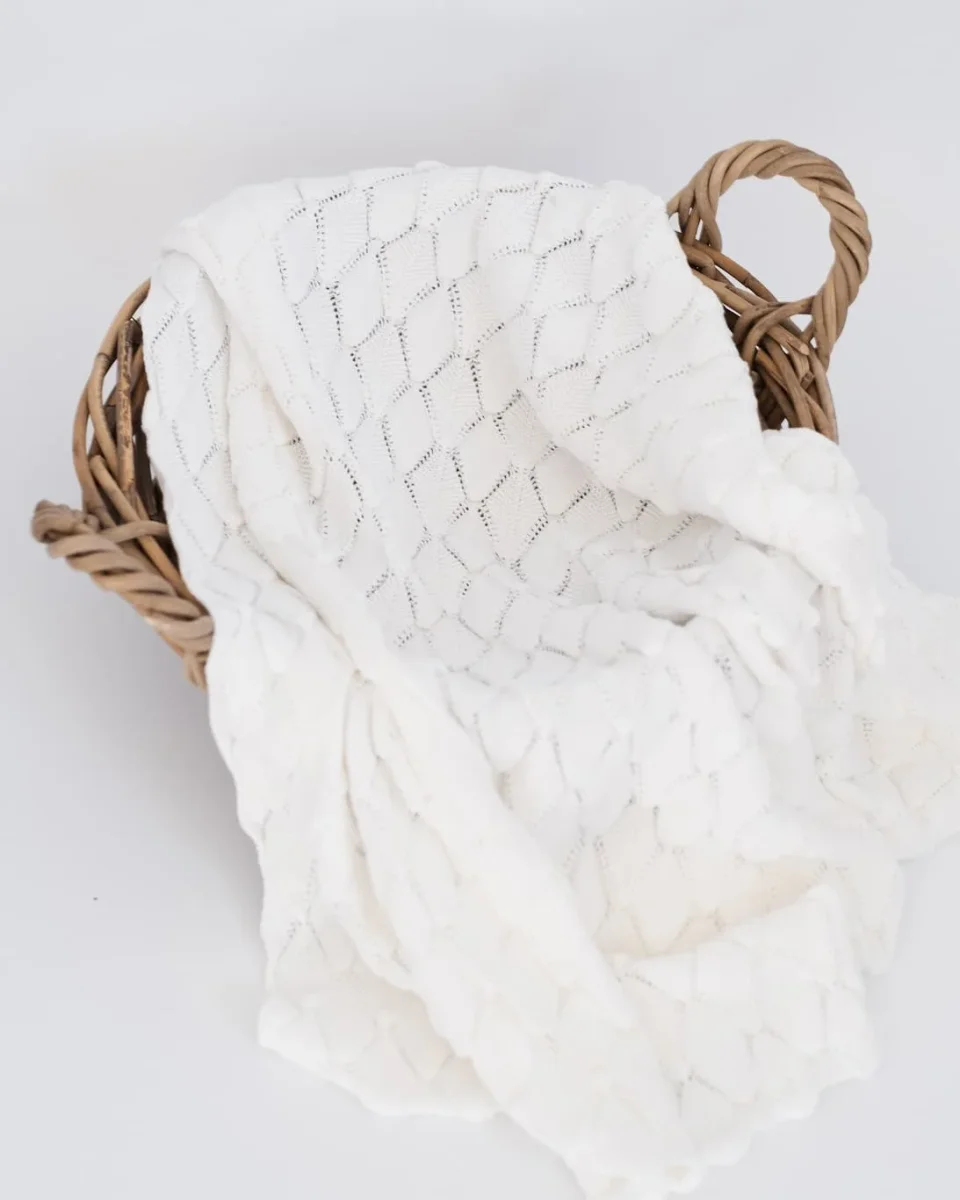 Ce bijou artisanal est tricoté dans un style crochet, créant un motif délicat qui évoque le charme intemporel du fait à la main. Le blanc éclatant de cette couverture ajoute une touche d’innocence et de pureté à l’environnement de votre bébé, qu’il s’agisse d’une sieste douillette dans le berceau ou d’un moment de câlin sur le canapé.