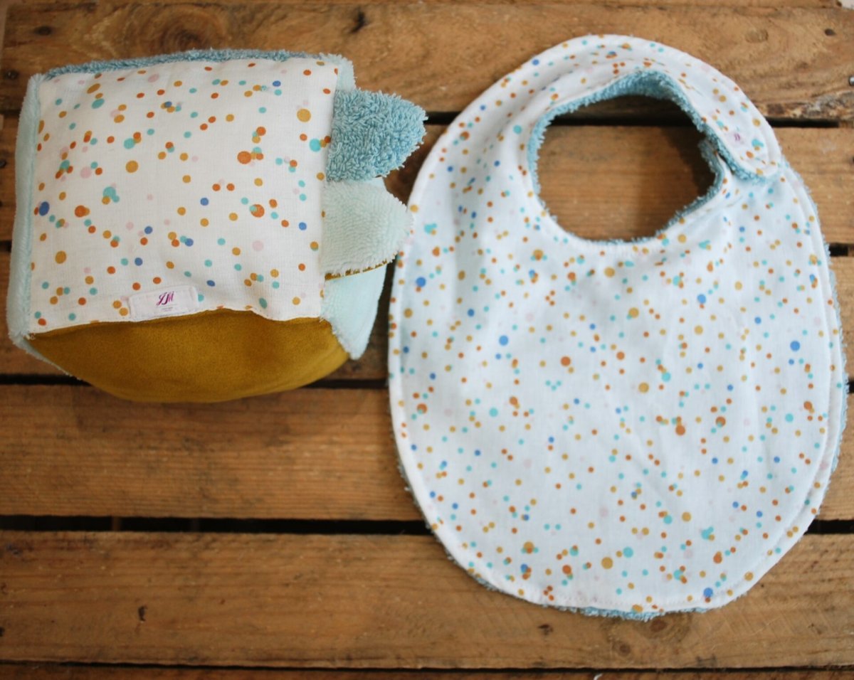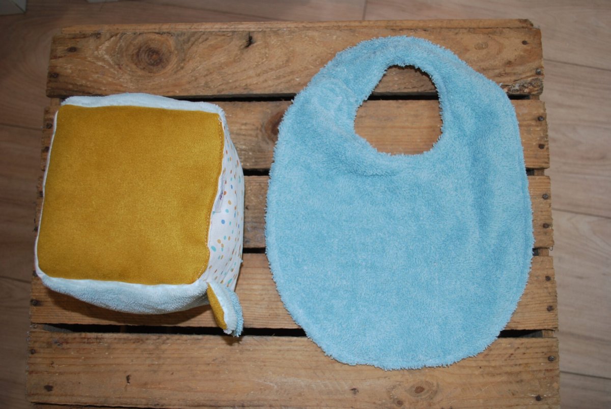 Cube d’éveil bébé  : Pour amuser bébé ce joli cube d’éveil avec un joli bavoir assorti. Ludique et sensoriel ce