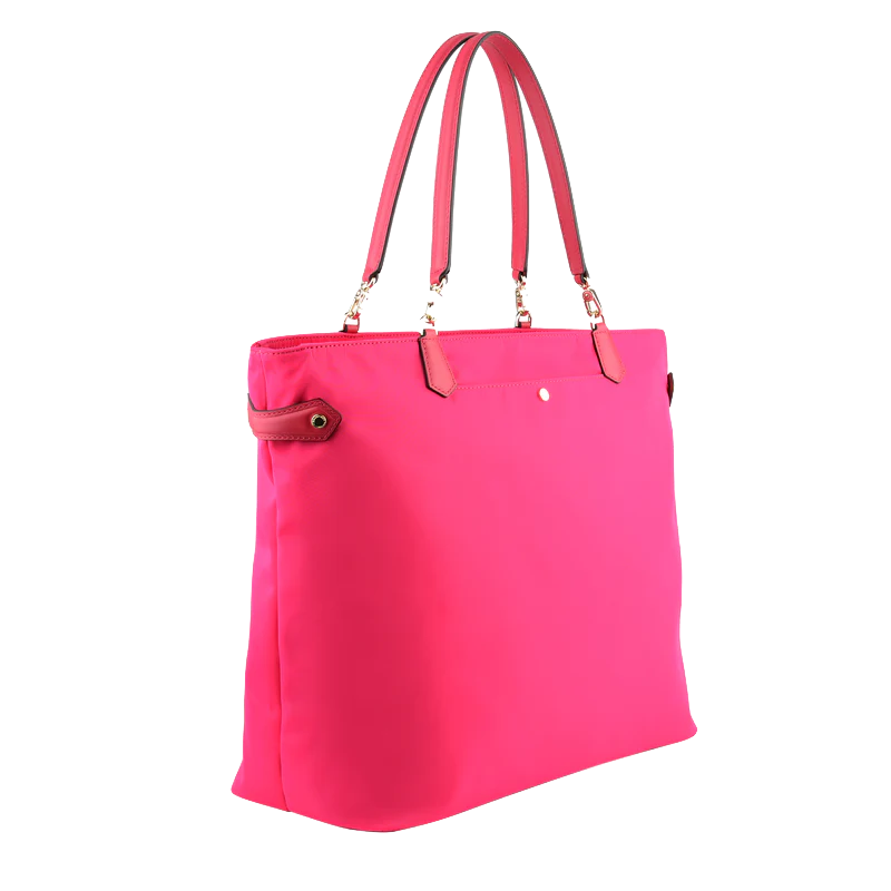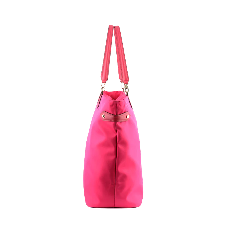 À l’intérieur, une poche nipée vous permet de garder vos petits objets bien organisés. Les longues anses robustes, également en fuchsia, assurent un port confortable à l’épaule, tandis que les détails en cuir ajoutent une touche de sophistication.