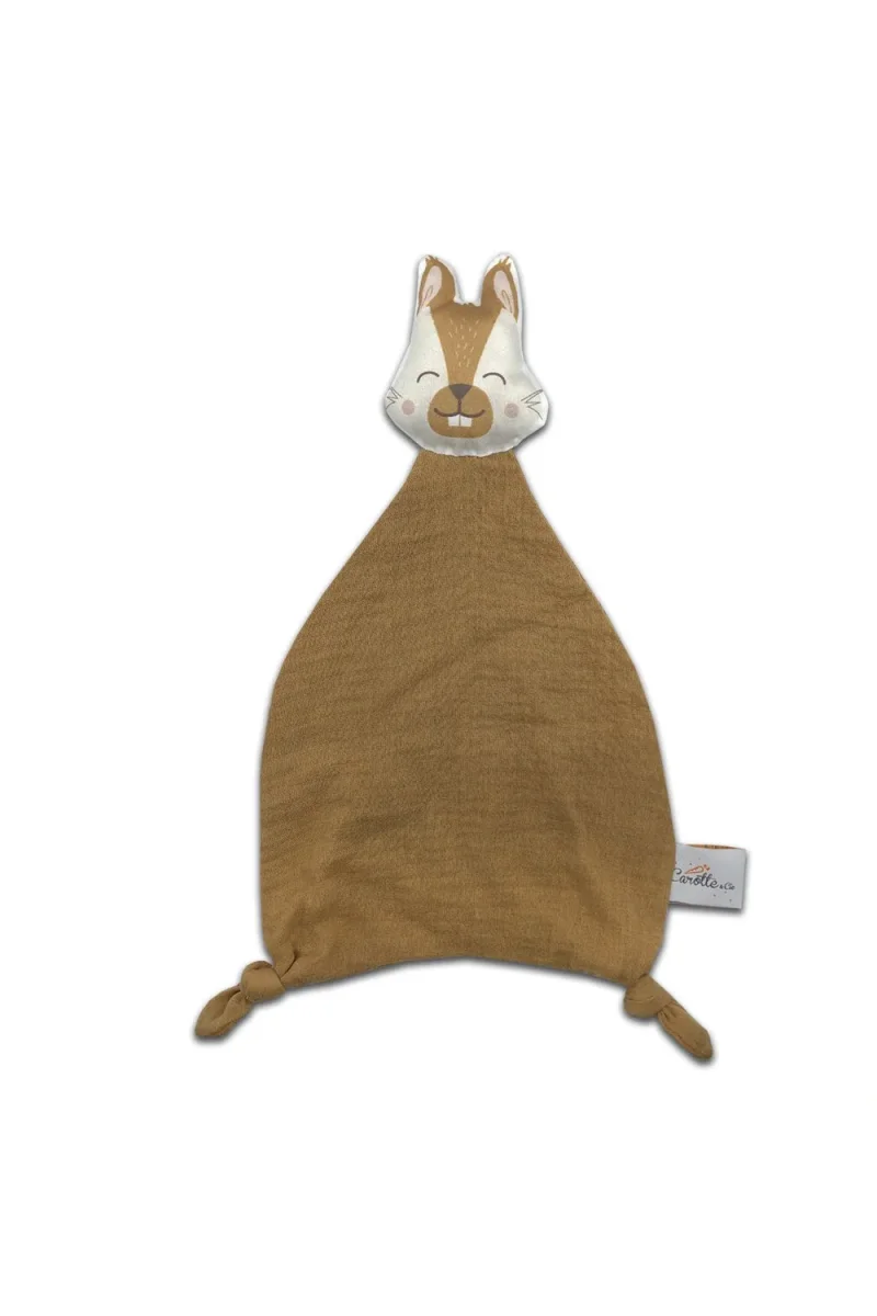Doudou Ecureuil en double gaze camel; compagnon idéal de bébé