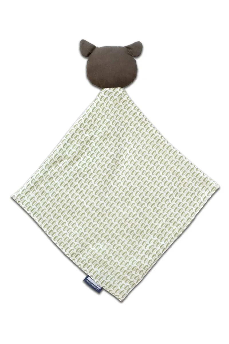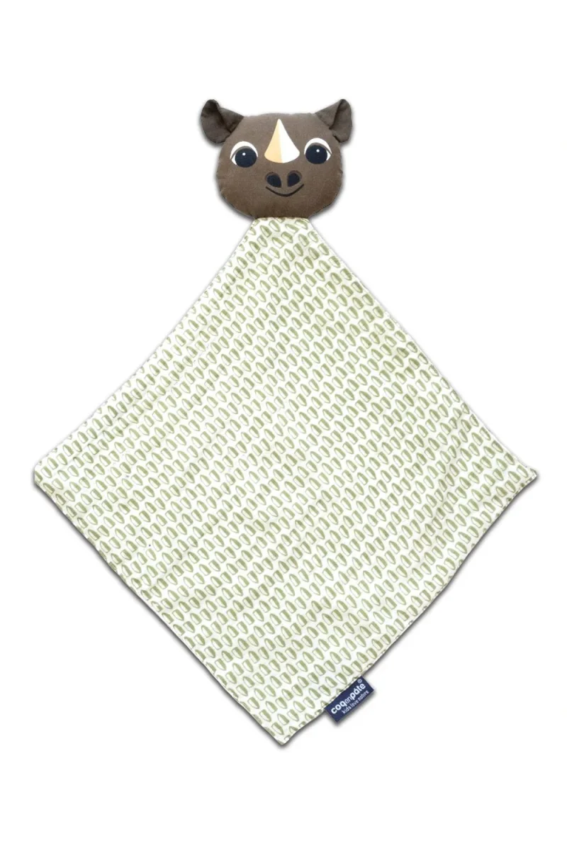 Doudou doux en coton biologique labellisé GOTS avec illustration rhinocéros. Le cadeau de naissance par excellence qui fait du bien à la planète et protège les animaux Matière : Tête : popline et remplissage 100% coton bio / Carré de tissu : mousseline double gaz en 100% coton bio / Packaging : carton recyclé Couleur : vert Dimensions : Tête animal : 10cm / Carré de tissu : 28 x 28 cm / Packaging : 13 x 13 x 2,5 cm Âge : O an et + Marquage CE Possibilité de composer un kit naissance avec les set bodies et bavoirs. Doudou fabriqué en Inde, respectant des normes sociales environnementales suivant les règles de l’OIT (organisation internationale du travail), traçabilité de la culture du coton à la confection. Entretien : Lavable en machine à 30°C, séchage à l’air libre