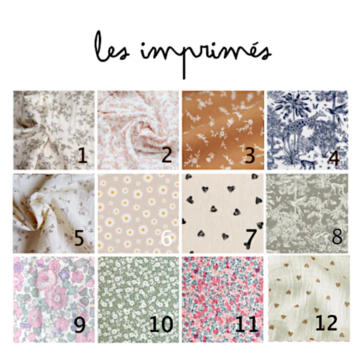 Nous déconseillons la personnalisation sur les tissus n° 4, 8 et 11 car le prénom ne se verra pas.