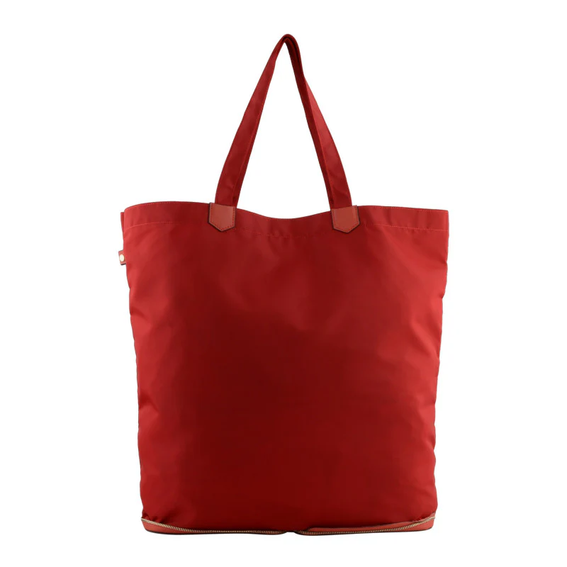 Le sac se transforme en pochette, idéale pour le ranger dans vos bagages. Sa forme rectangulaire et sa fermeture éclair sur le dessus, agrémentée d’un petit tirette, facilitent son utilisation.
