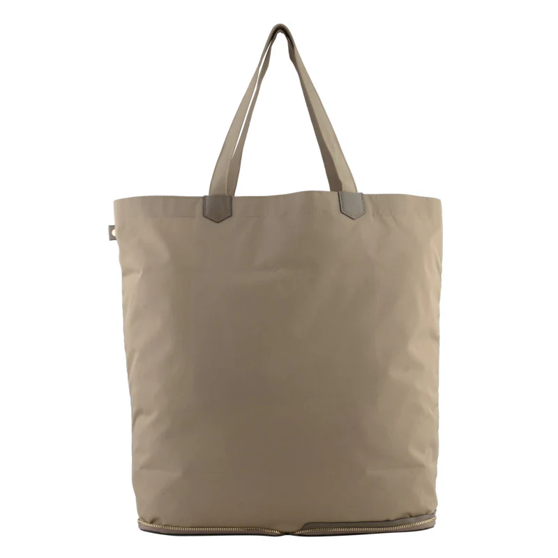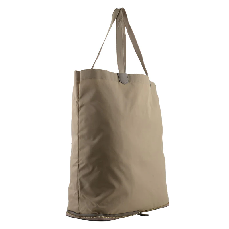 Les anses, renforcées et de couleur taupe plus claire, permettent un port à la main ou sur l’épaule, ajoutant ainsi une touche de sophistication. La fermeture éclair située au bas du sac assure la sécurité de vos effets personnels.