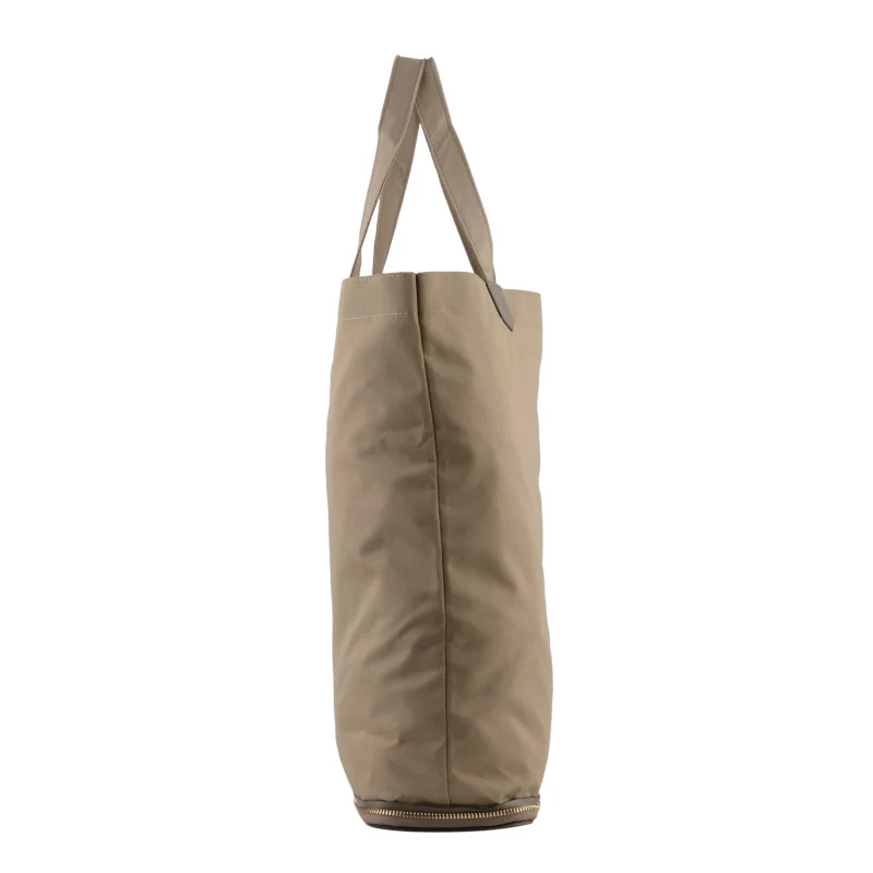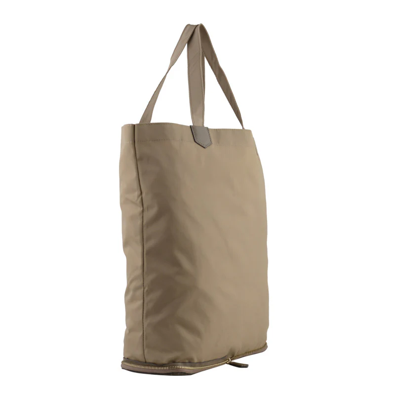 Le design du sac est classique avec une forme tote, équipé de deux anses en nylon pour un confort optimal, que ce soit à la main ou à l’épaule. La fermeture éclair à la base du sac ajoute une sécurité supplémentaire pour vos effets personnels. De plus, des détails en cuir ornent les extrémités des anses, apportant une touche de sophistication.