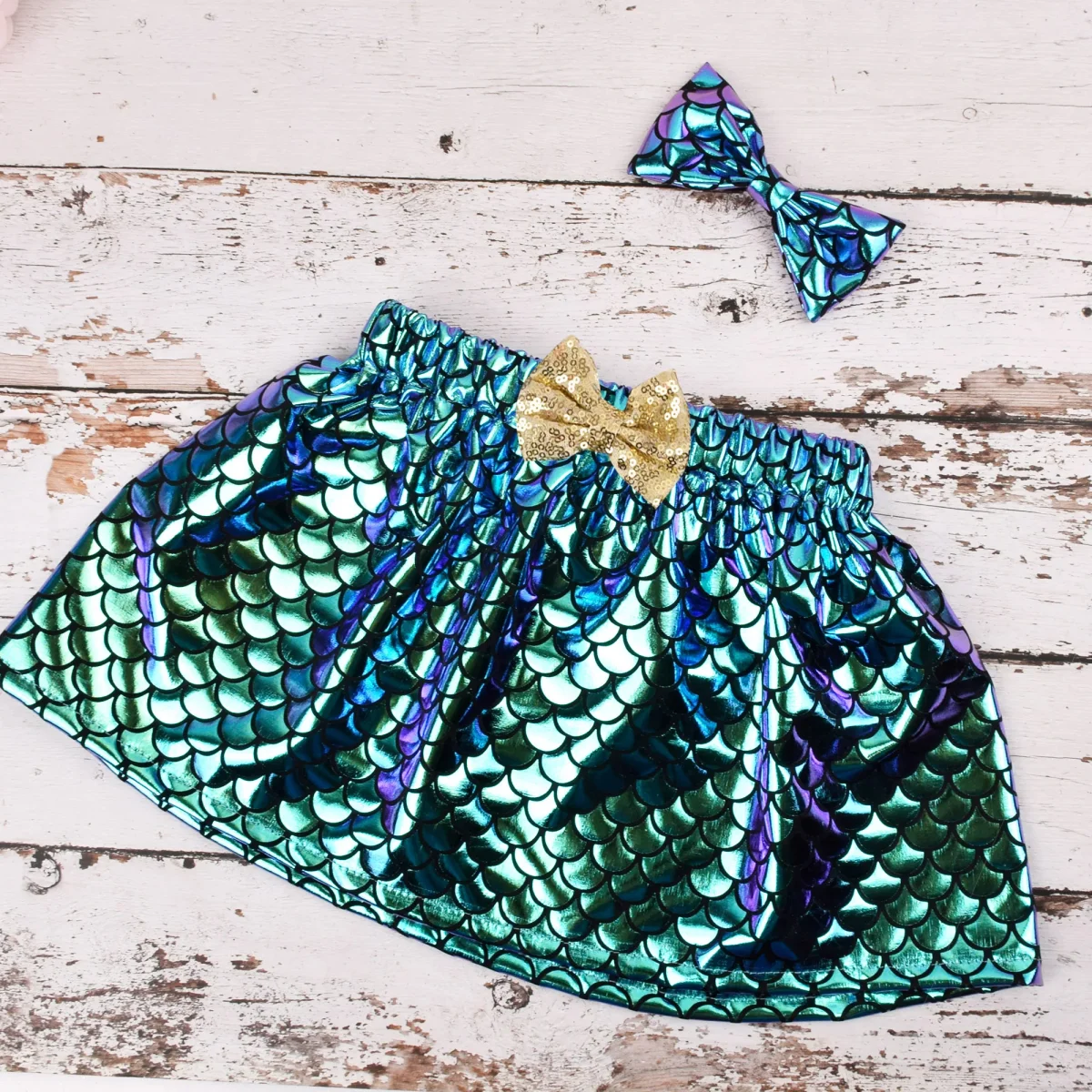 La jupe vert émeraude capture l’essence même des fonds marins avec son motif écaille distinctif. Les volants de la jupe apportent une touche de légèreté, évoquant le mouvement gracieux des nageoires de sirène. La couleur vibrante et les détails soignés font de cette jupe un élément central de l’ensemble, ajoutant une note de féérie à l’ensemble.