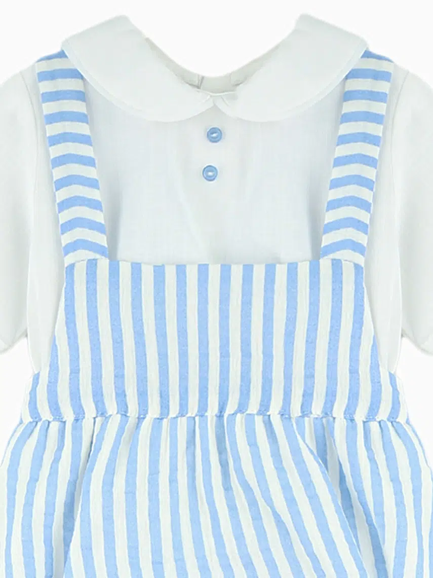 Plongez dans l’univers du style classique et raffiné avec notre ensemble barboteuse rayée et blouse blanche, une tenue élégante et intemporelle pour habiller votre petit garçon avec charme. Conçu avec le plus grand soin, cet ensemble associe une barboteuse rayée bleu ciel et blanc à bretelles croisées dans le dos et une blouse blanche délicatement travaillée, pour un look à la fois chic et confortable.