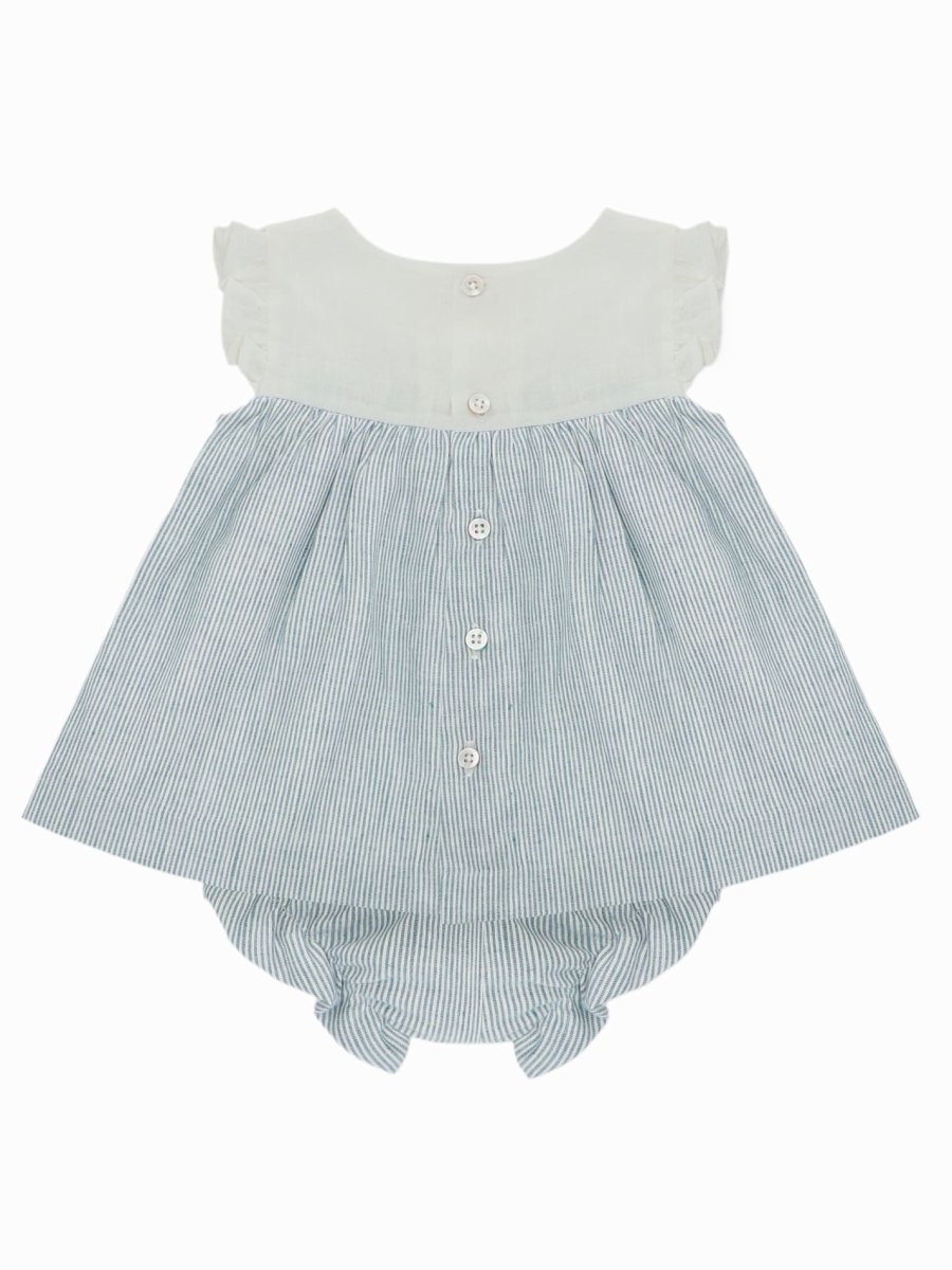 La robe est dotée d’une patte de boutonnage au dos, qui facilite l’habillage et le déshabillage. Le bloomer à taille élastiquée assure un maintien souple et confortable, permettant à bébé de bouger librement.