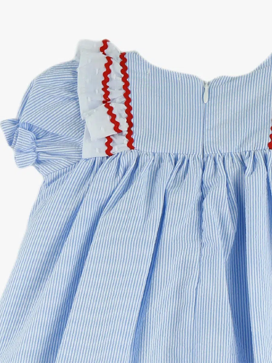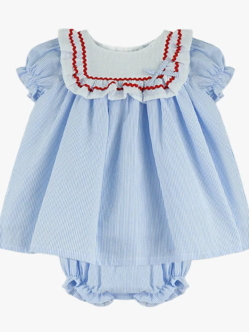 Découvrez notre ravissant ensemble bébé fille blouse et bloomer rayés, un incontournable de la garde-robe estivale. Cet ensemble associe élégance et praticité, parfait pour habiller votre petite avec style. La blouse à manches ballon, d’une féminité irrésistible, se distingue par son délicat col en plumetis blanc orné de liserés rouges. Ses fines rayures bleu et blanc ajoutent une touche classique et intemporelle.