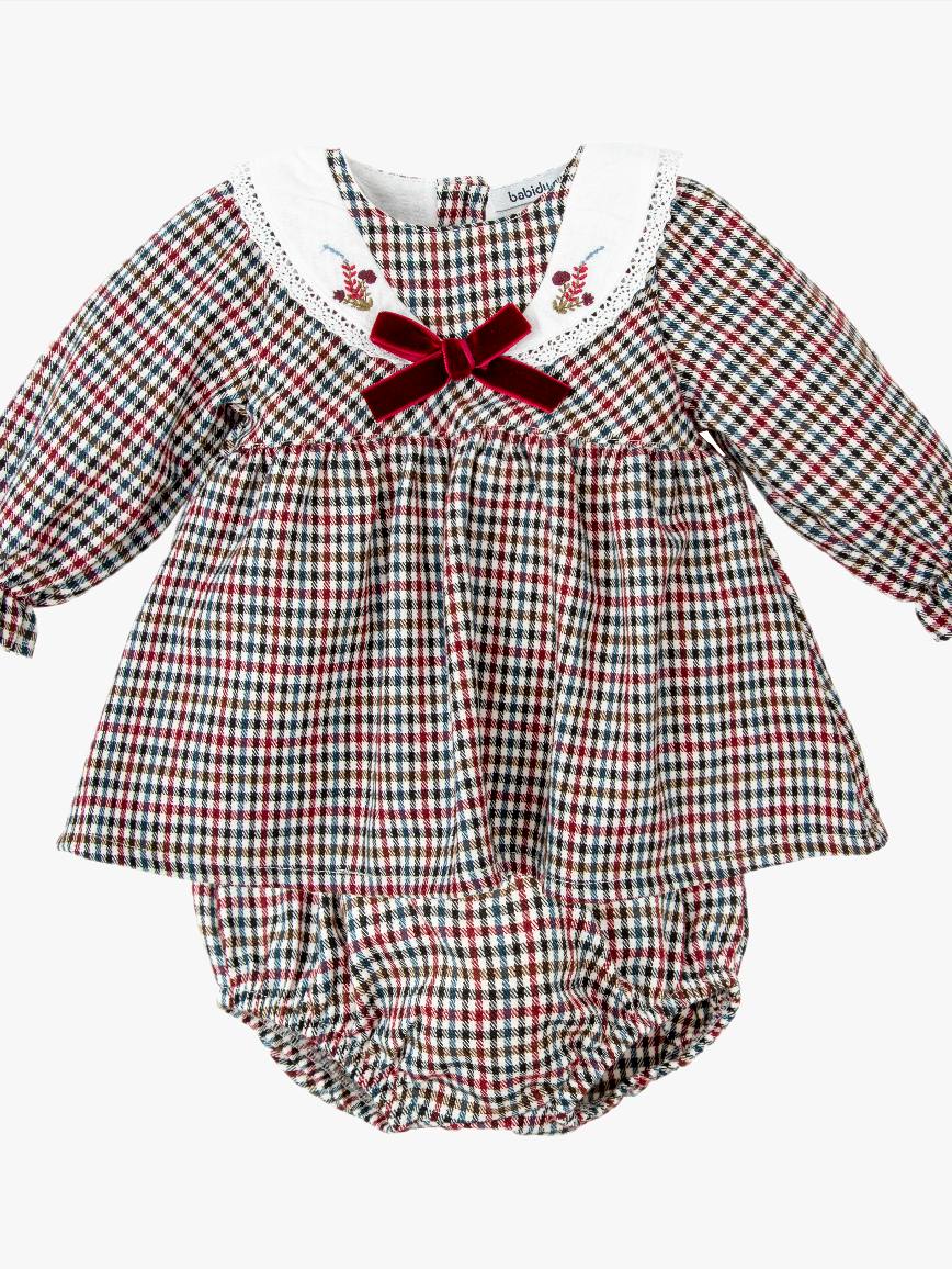 Imaginé et confectionné avec soin en Espagne, cet ensemble robe courte bébé et bloomer assorti en tissu tartan représente l’attention méticuleuse portée aux détails et la recherche de qualité. Résolument féminine et pleine de charme, cette pièce deviendra vite un incontournable dans la garde-robe de votre petite fille, combinant style, confort et durabilité. Ajoutez ce trésor intemporel et laissez votre enfant rayonner à chaque instant.