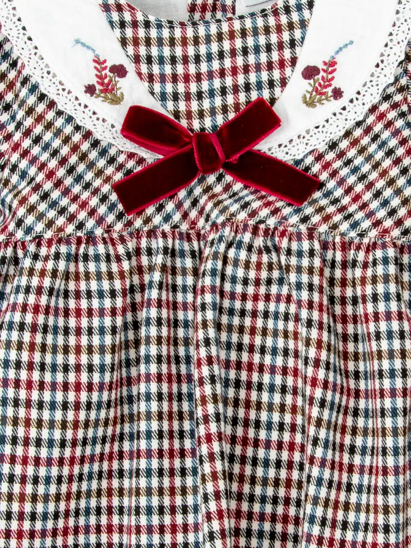 Plongez dans l’élégance nostalgique avec notre ensemble robe courte bébé en tissu tartan sur fond bordeaux et son bloomer assorti, une magnifique pièce enrichie de détails en velours. Conçu spécialement pour les petites filles, cette ensemble allie charme rétro et modernité avec son nœud en velours rouge et son col blanc délicatement bordé de dentelle. Les manches longues et les broderies florales ajoutent une touche raffinée et sophistiquée, idéale pour toutes les occasions, qu’elles soient spéciales ou quotidiennes.
