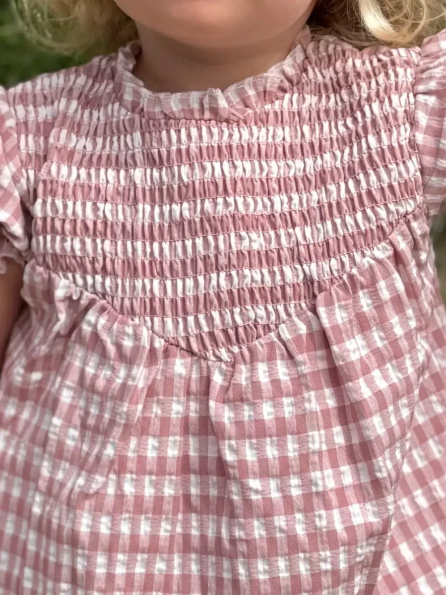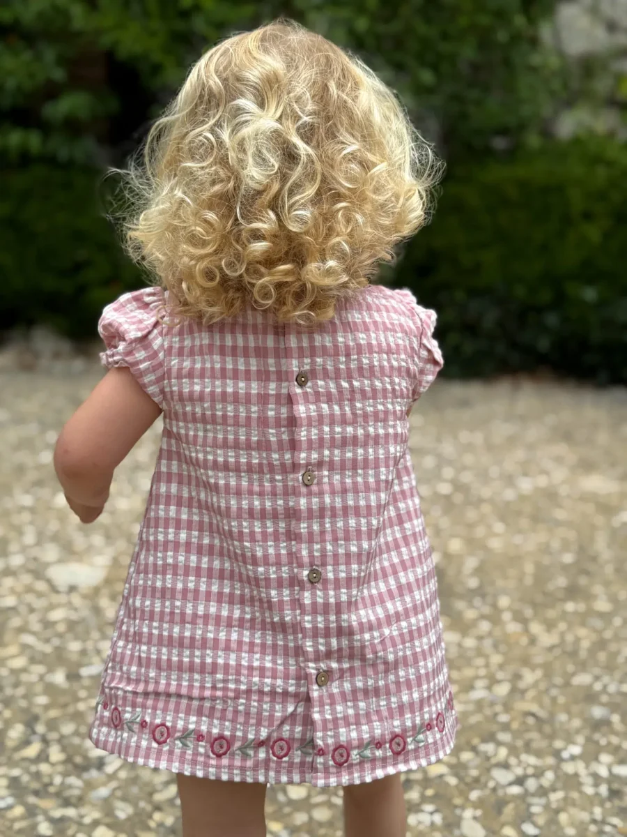 La robe vichy, avec ses smocks délicats à l’avant, se distingue par son col légèrement montant à froufrous, qui ajoute une note rétro-chic au design. Les manches légèrement bouffantes apportent du volume et de la douceur, tandis que les fleurs brodées sur le bas de la robe évoquent une esthétique bucolique et raffinée. Légère et aérienne, cette blouse est parfaite pour garder votre bébé à l’aise, même lors des journées les plus chaudes.