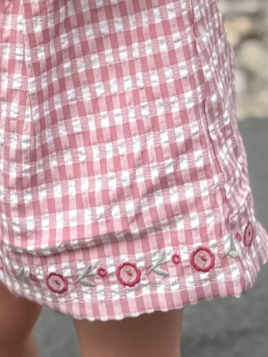 Le bloomer assorti, confectionné dans le même tissu vichy, complète harmonieusement l’ensemble. Avec sa coupe ample et sa taille élastiquée, il offre une grande liberté de mouvement tout en restant bien en place. Ce vêtement est aussi charmant porté seul que coordonné à la blouse, pour une tenue totalement assortie.