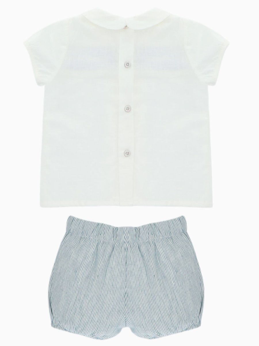 Le bloomer short à taille élastiquée, rayé de fines lignes bleu et blanc, complète parfaitement la tenue en apportant légèreté et aisance pour les mouvements de bébé.