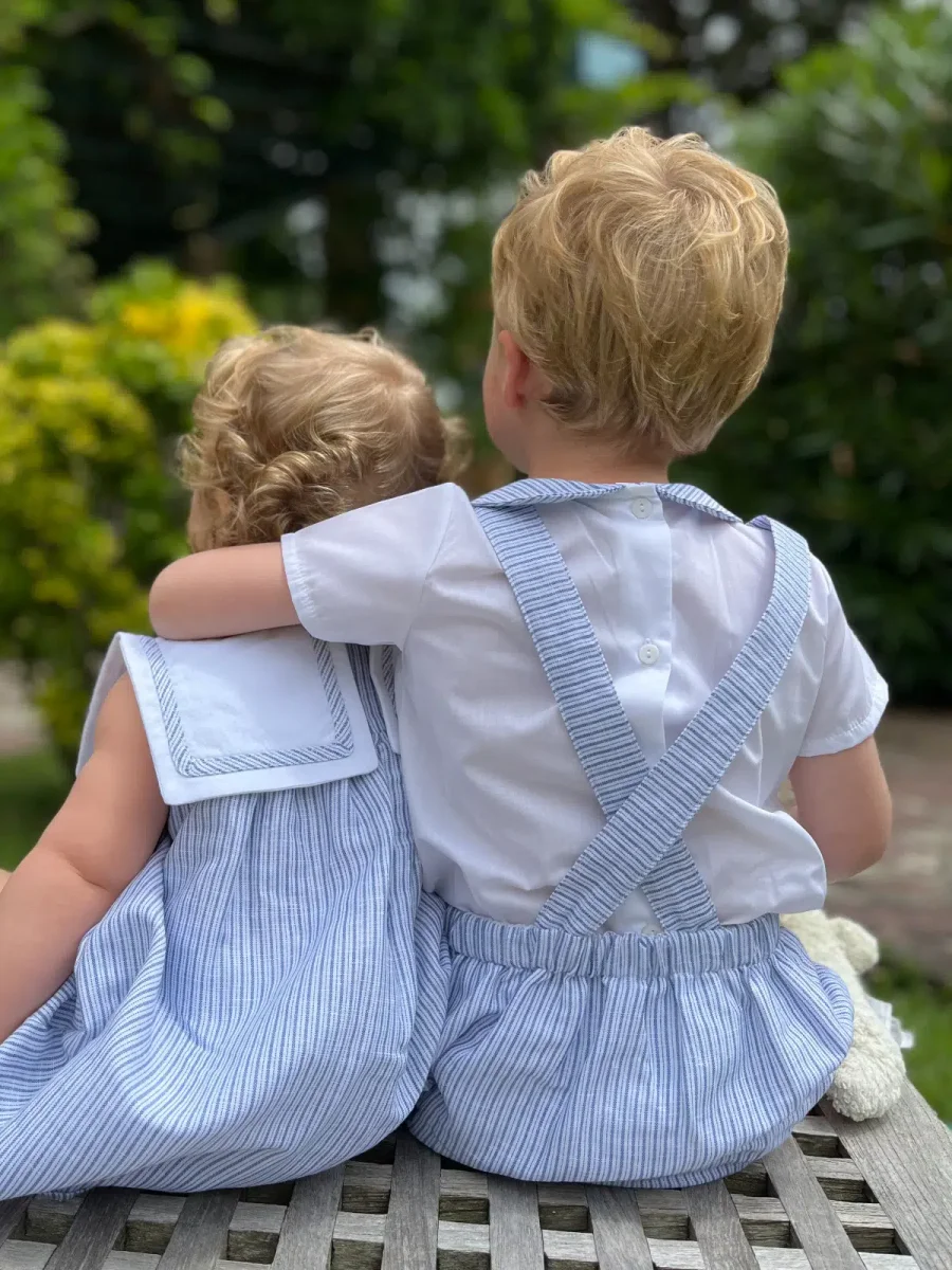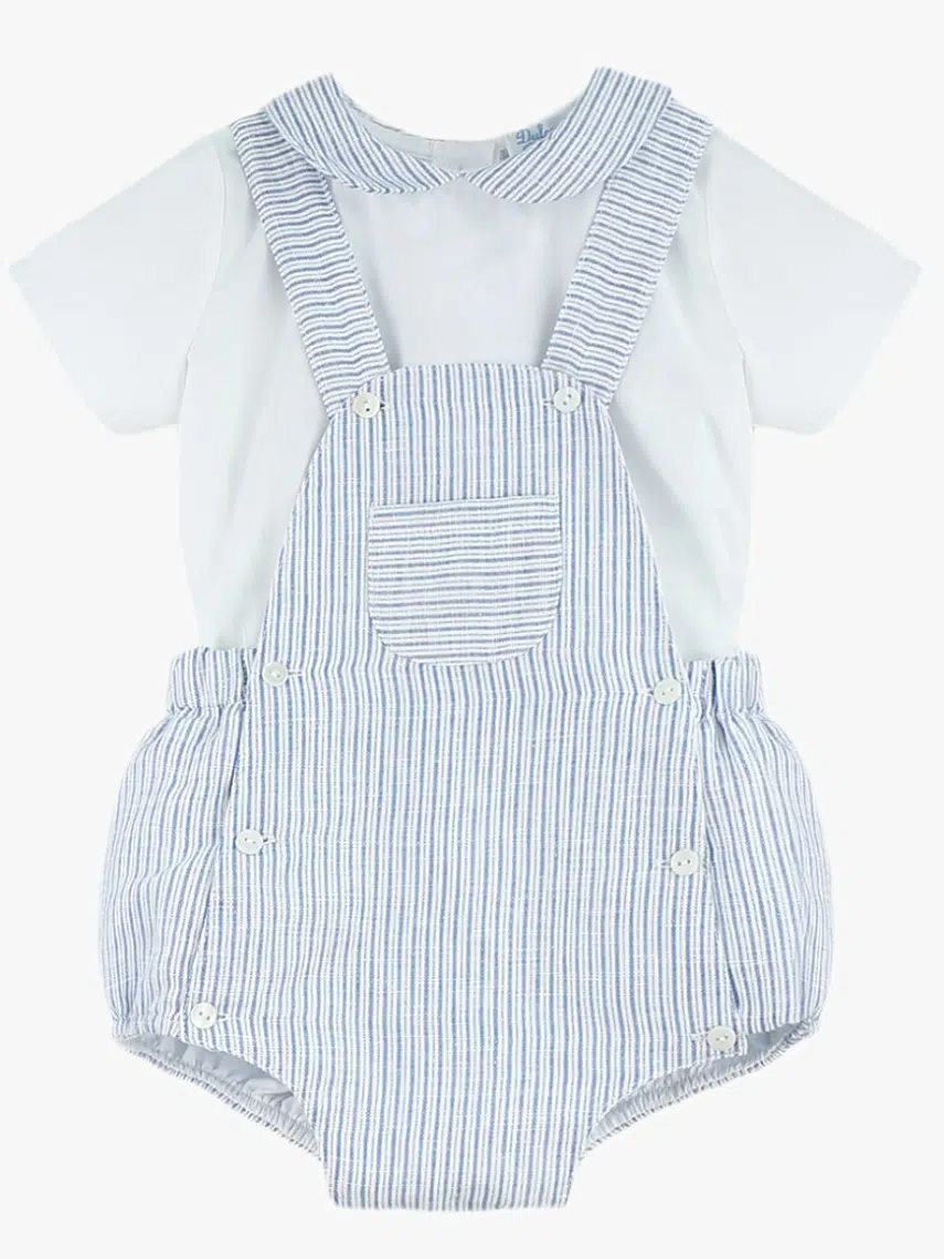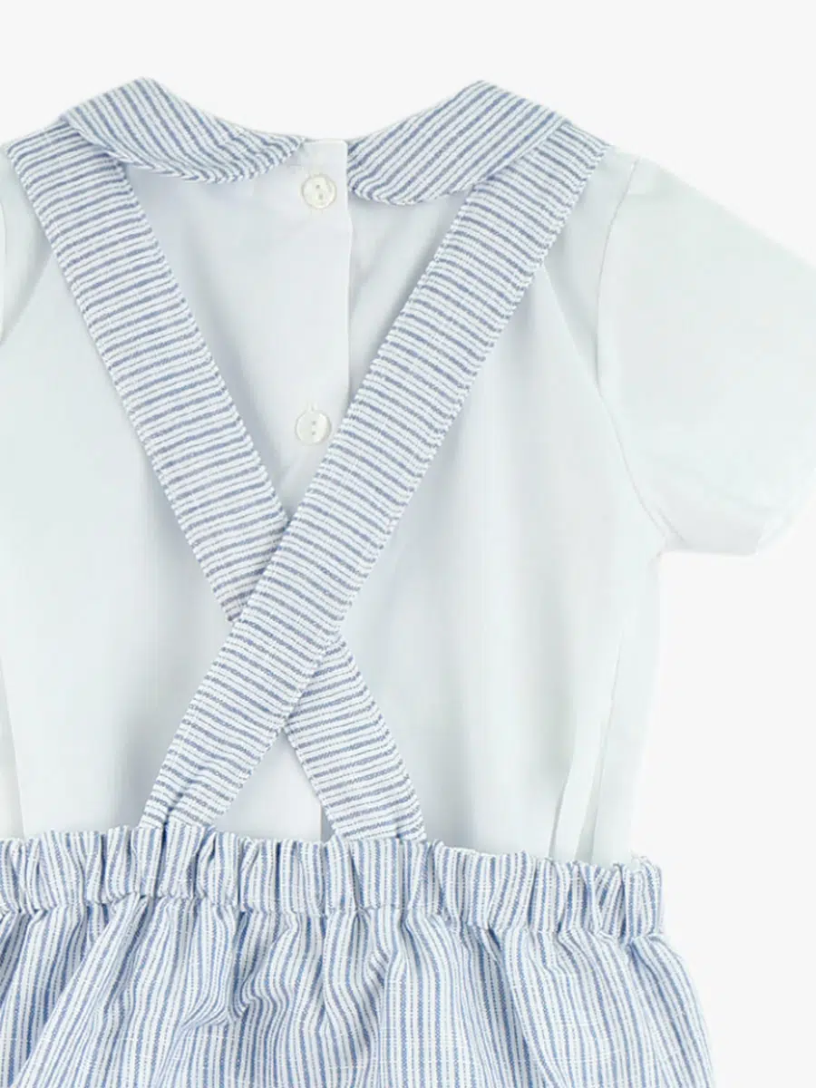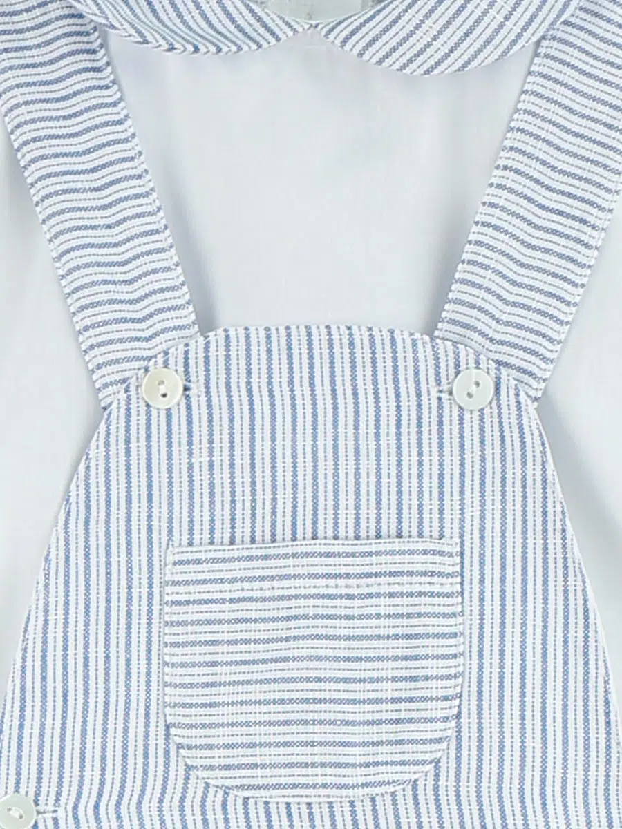 La chemise blanche en coton doux se distingue par son col rond orné de rayures bleues et blanches, une touche subtile qui évoque les horizons marins et l’air salin. La salopette rayée assortie, également en coton de haute qualité, offre une coupe pratique et confortable, conçue pour accompagner votre enfant dans tous ses mouvements.