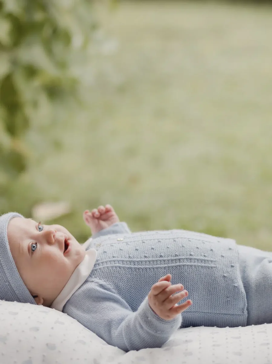 Le point mousse, symbole de tendresse et de raffinement, apporte un charme authentique à cet ensemble. Ce tricotage traditionnel se marie à merveille avec le bleu doux de l’ensemble, créant une tenue poétique, parfaite pour les premiers mois de votre enfant ou pour offrir en cadeau de naissance.